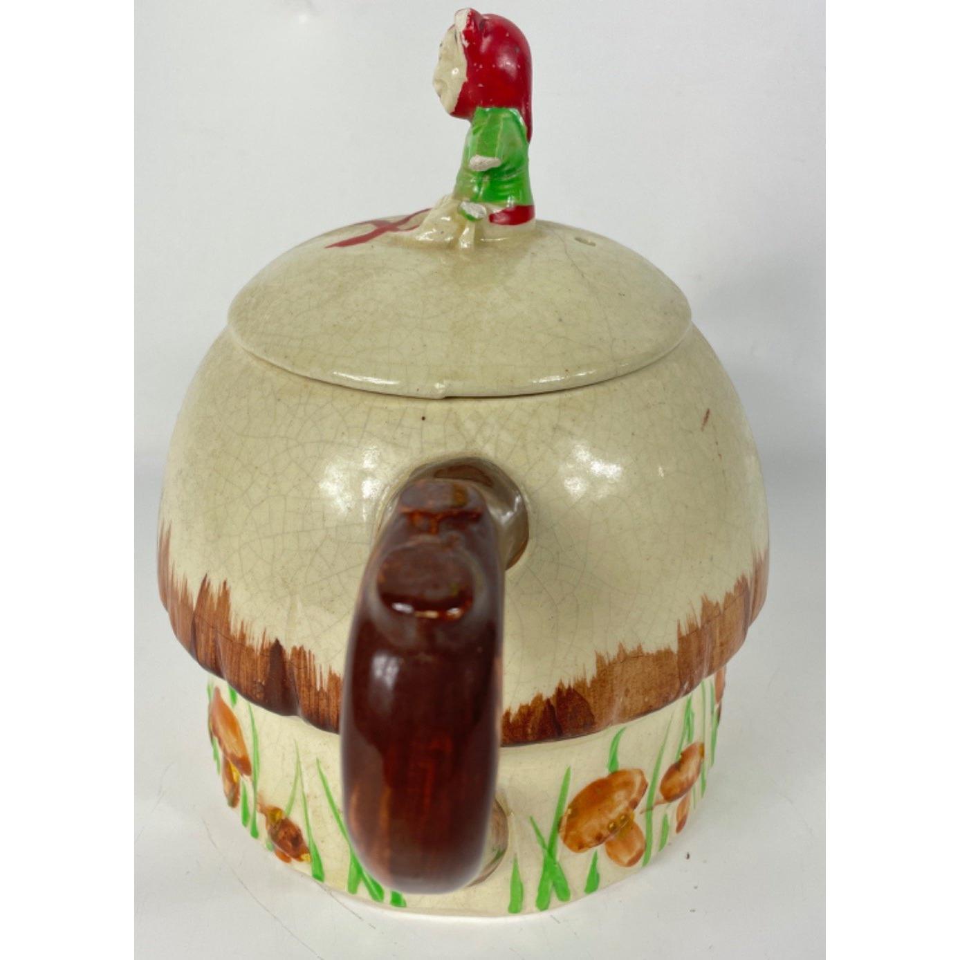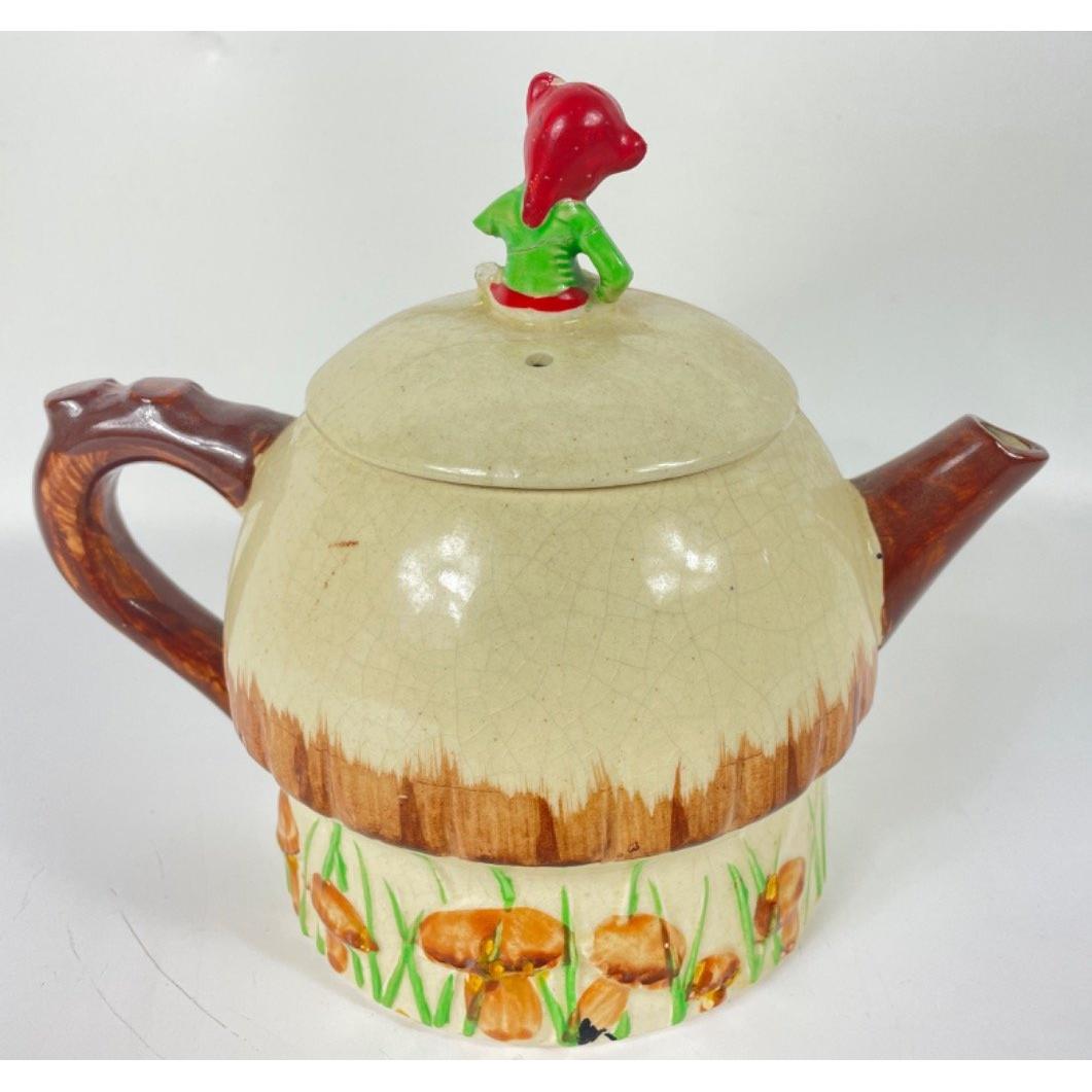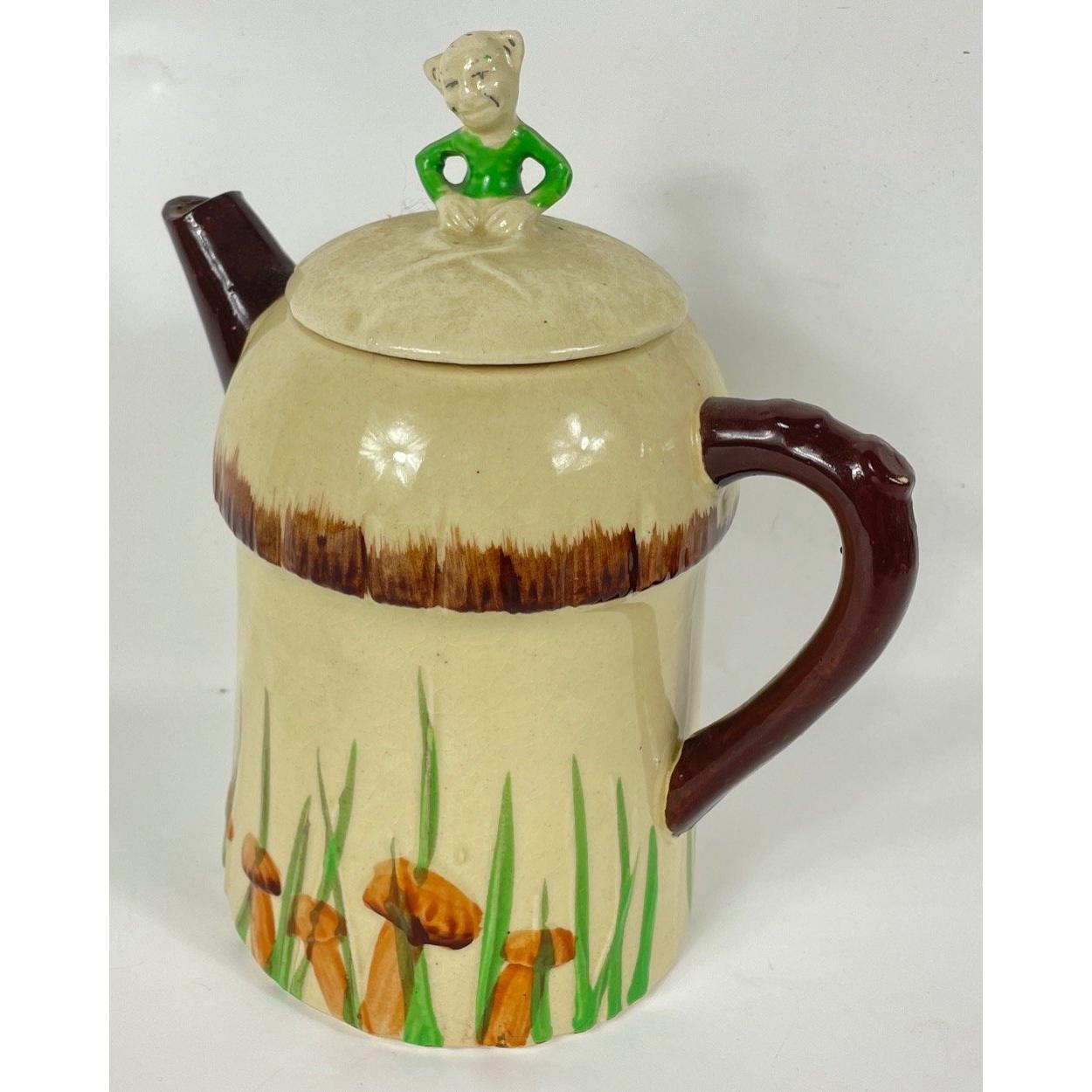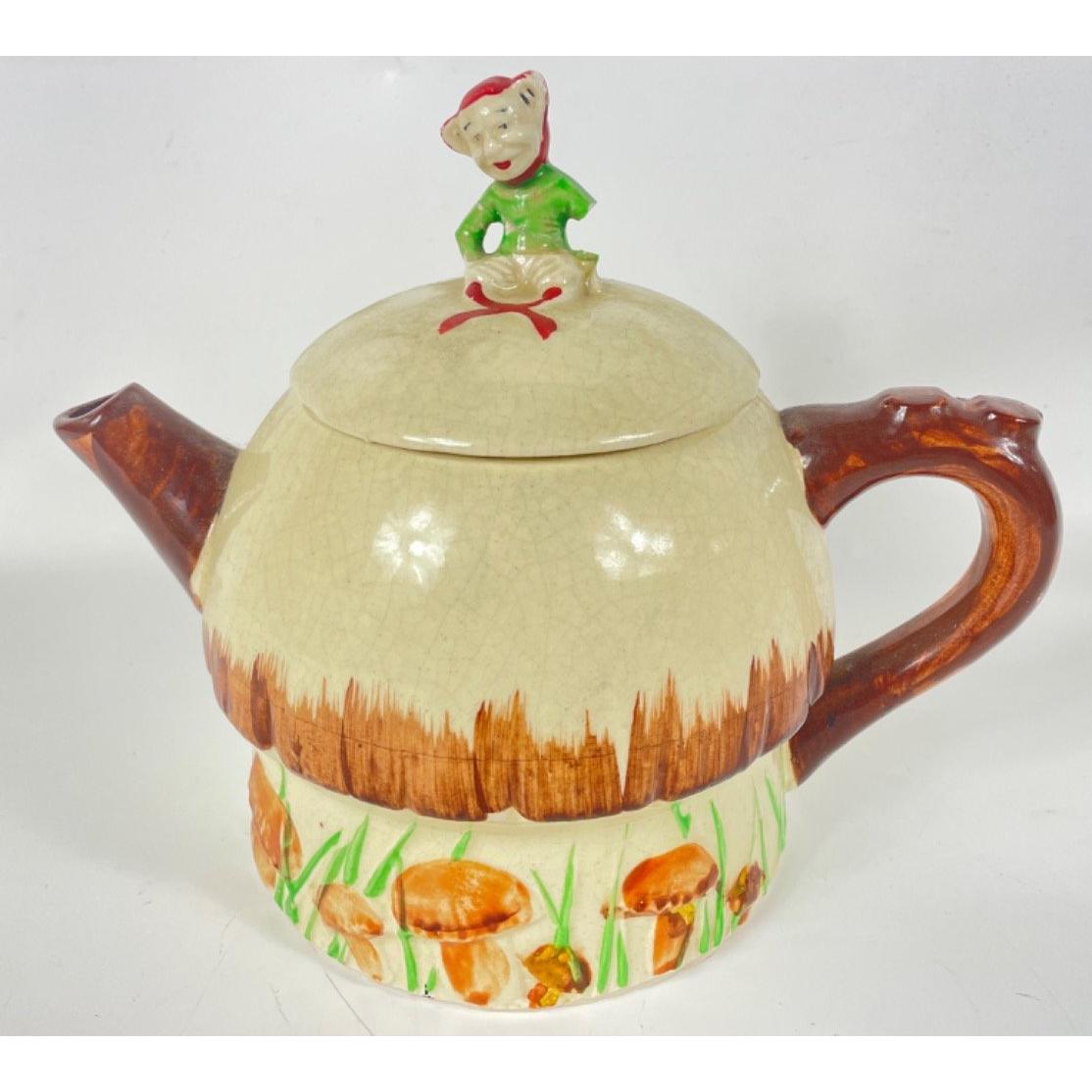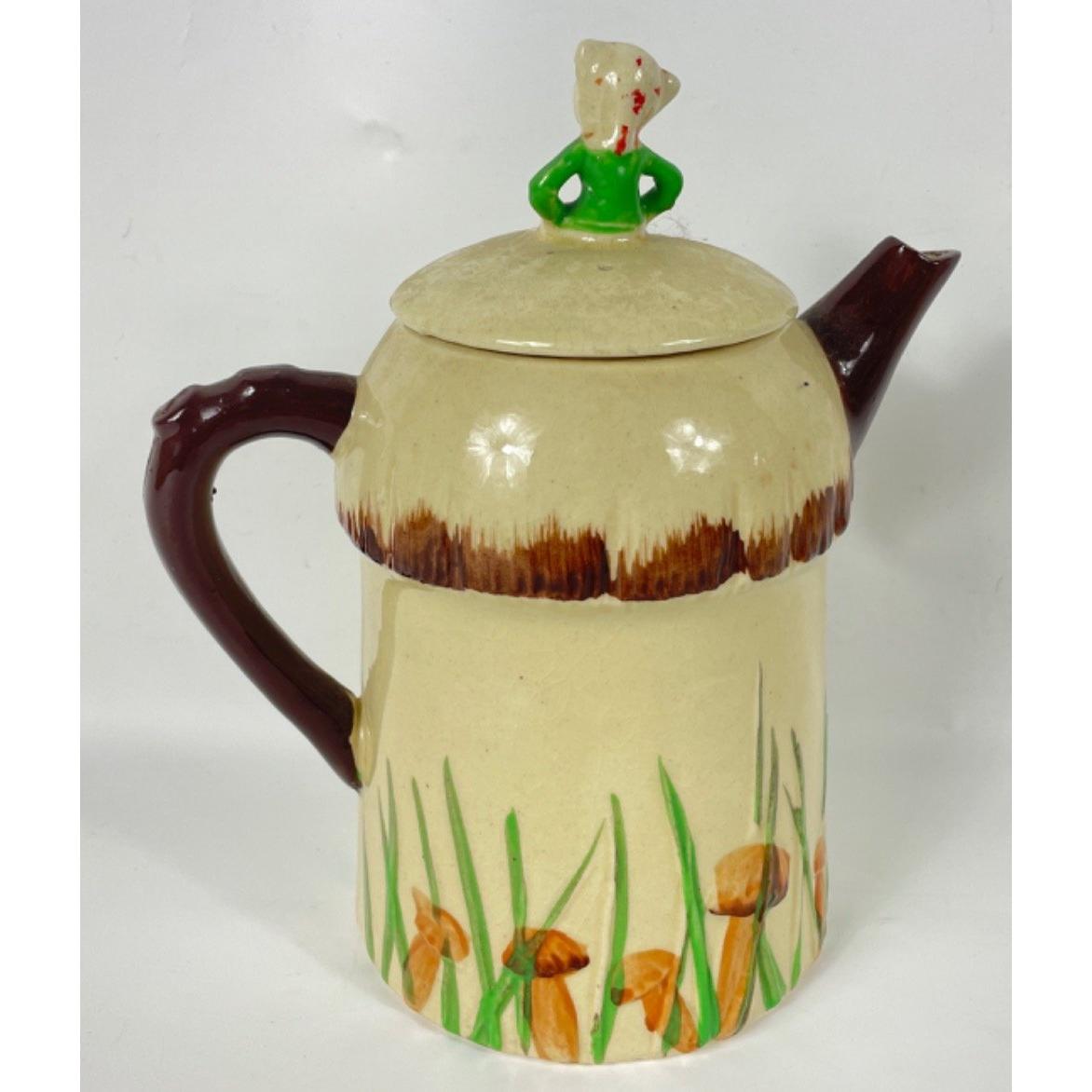 A KEELE STREET pottery teapot (16cm high with milk jug and sugar bowl, a SUVESCO goblin teapot (19cm high, broken arm) and coffee pot (21cm high), a trivet by T DEAN & SONS (13x13cm), and a small biscuit barrel with wicker handle (13cm high)
