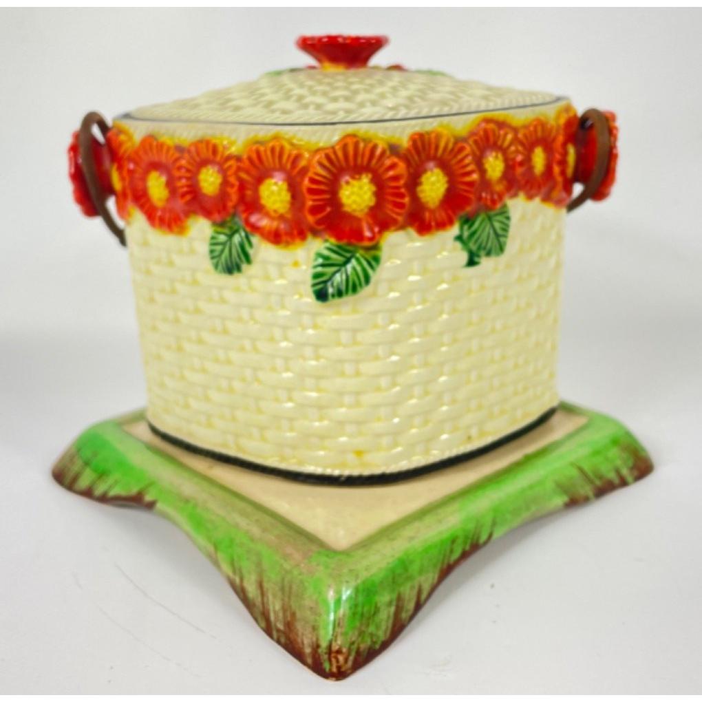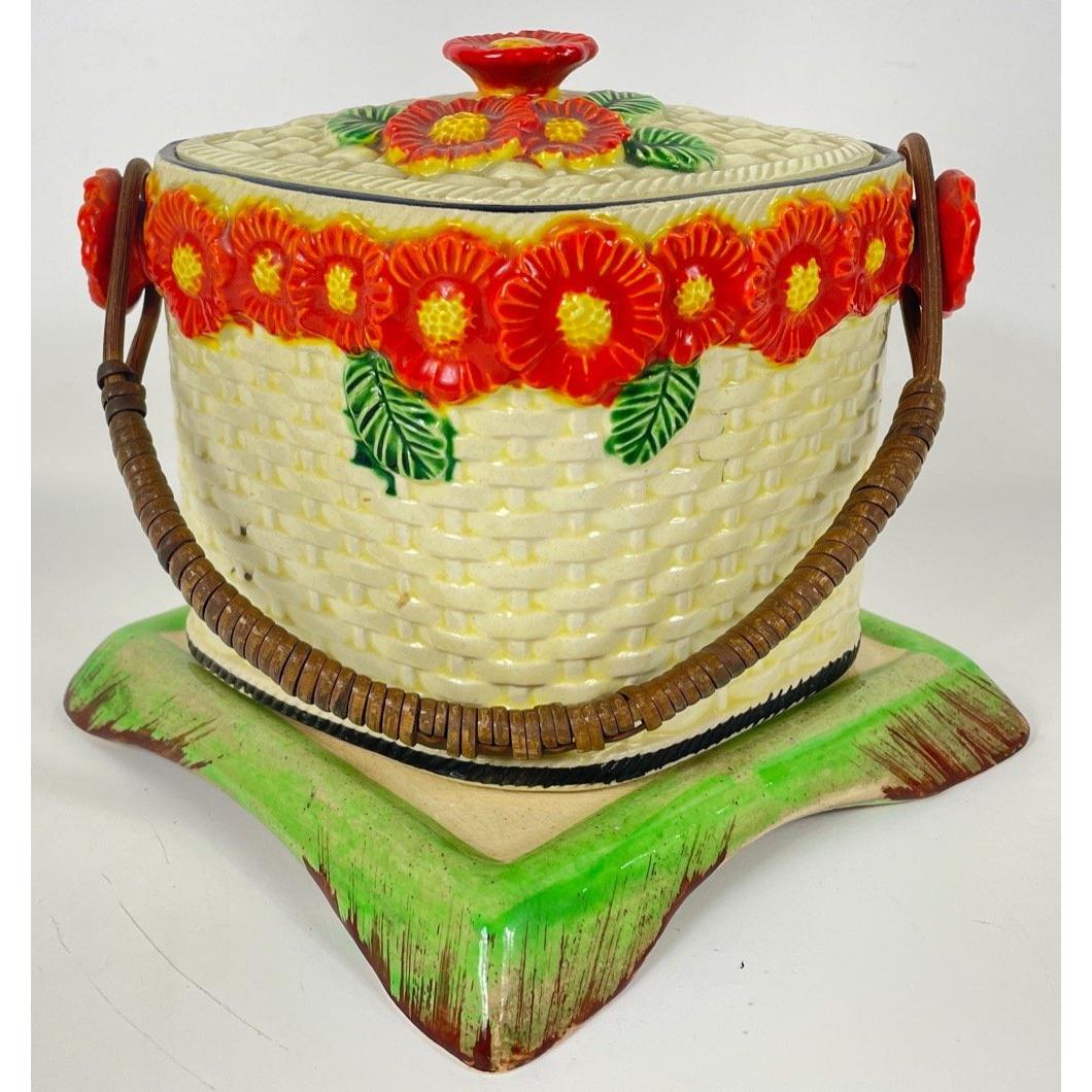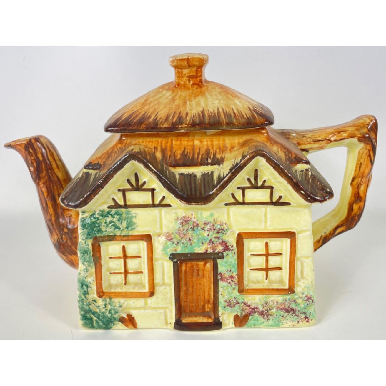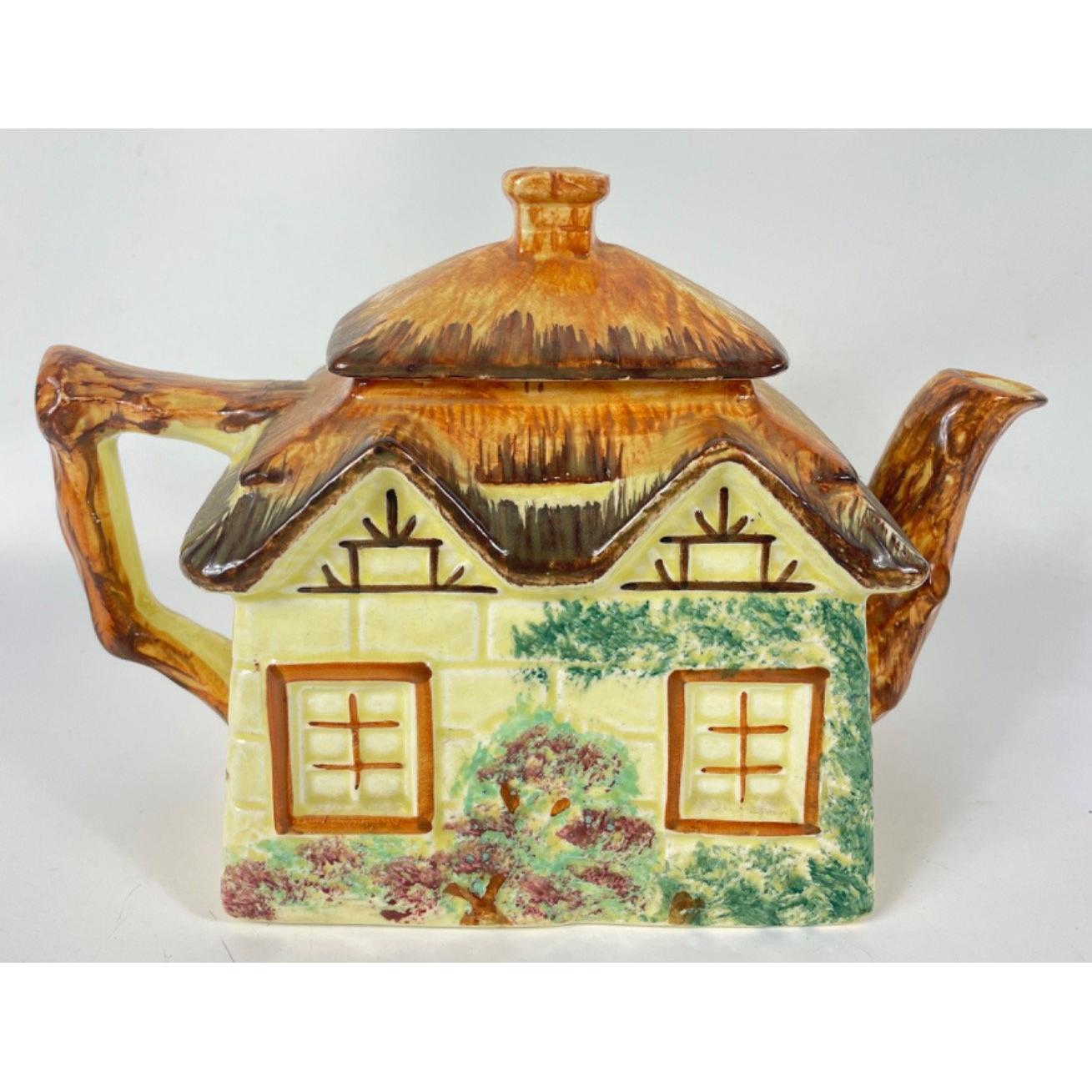 A KEELE STREET pottery teapot (16cm high with milk jug and sugar bowl, a SUVESCO goblin teapot (19cm high, broken arm) and coffee pot (21cm high), a trivet by T DEAN & SONS (13x13cm), and a small biscuit barrel with wicker handle (13cm high)