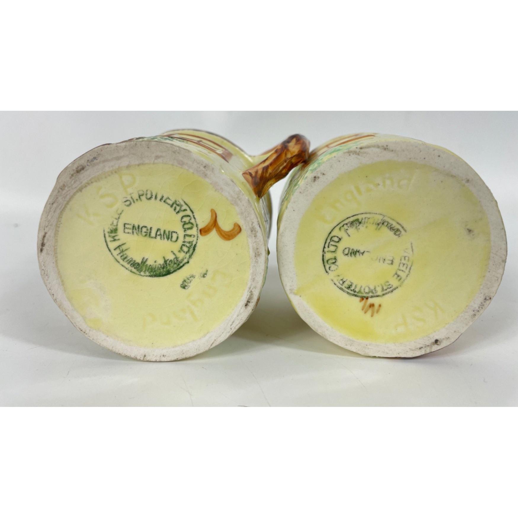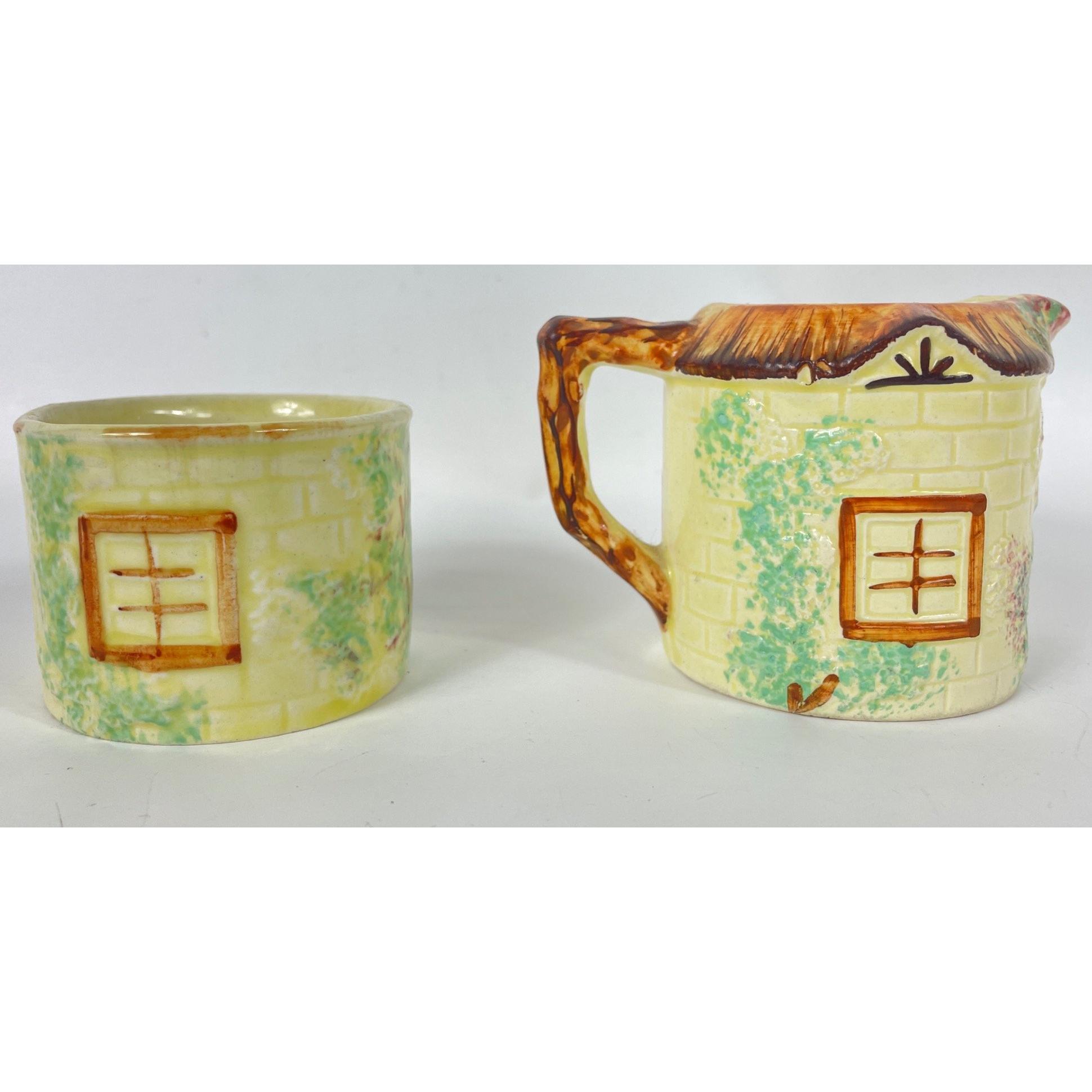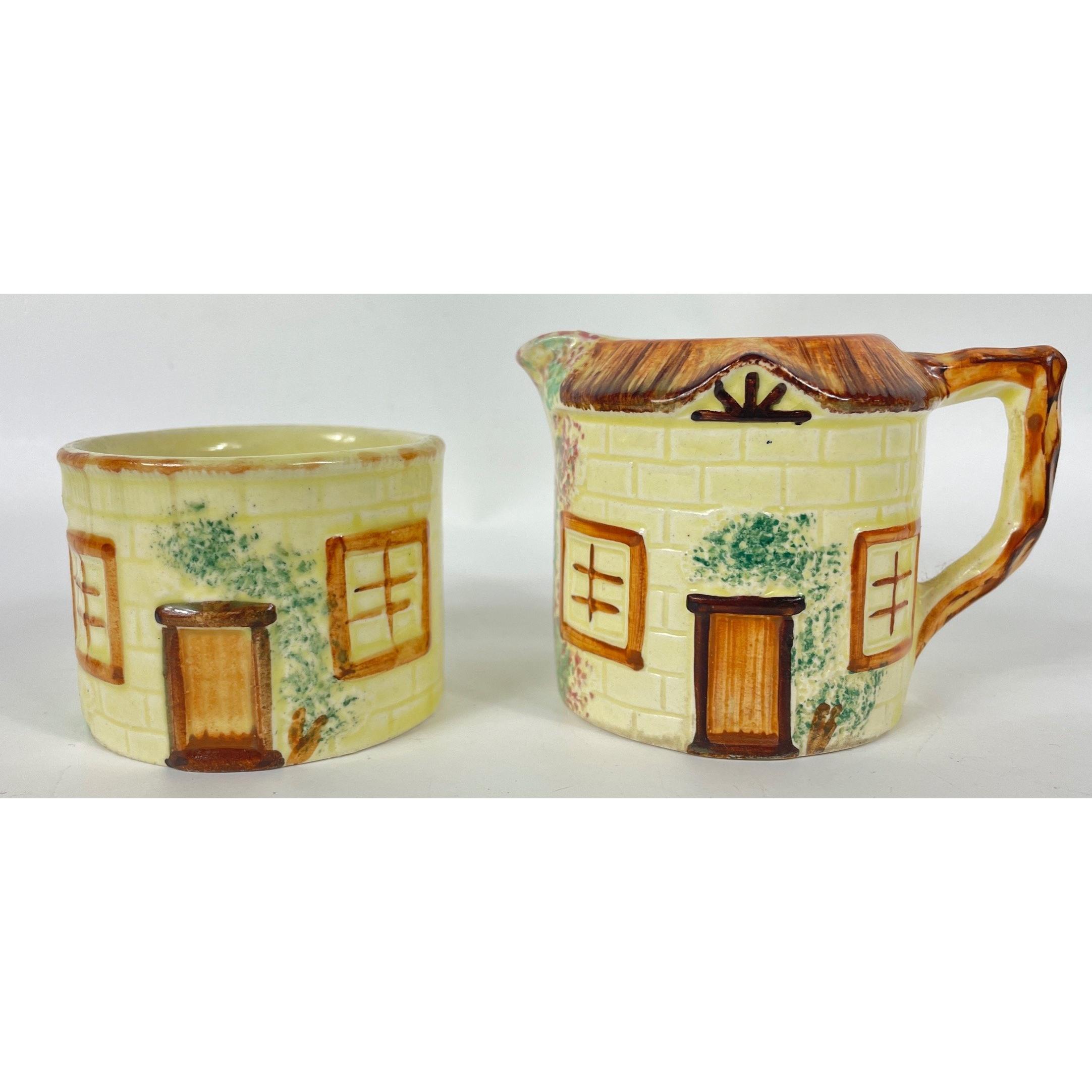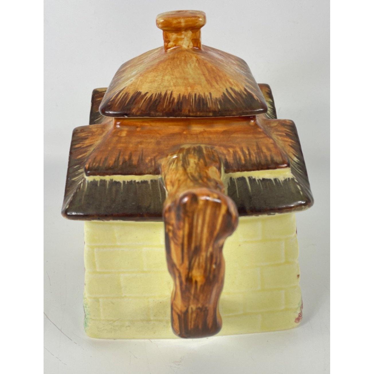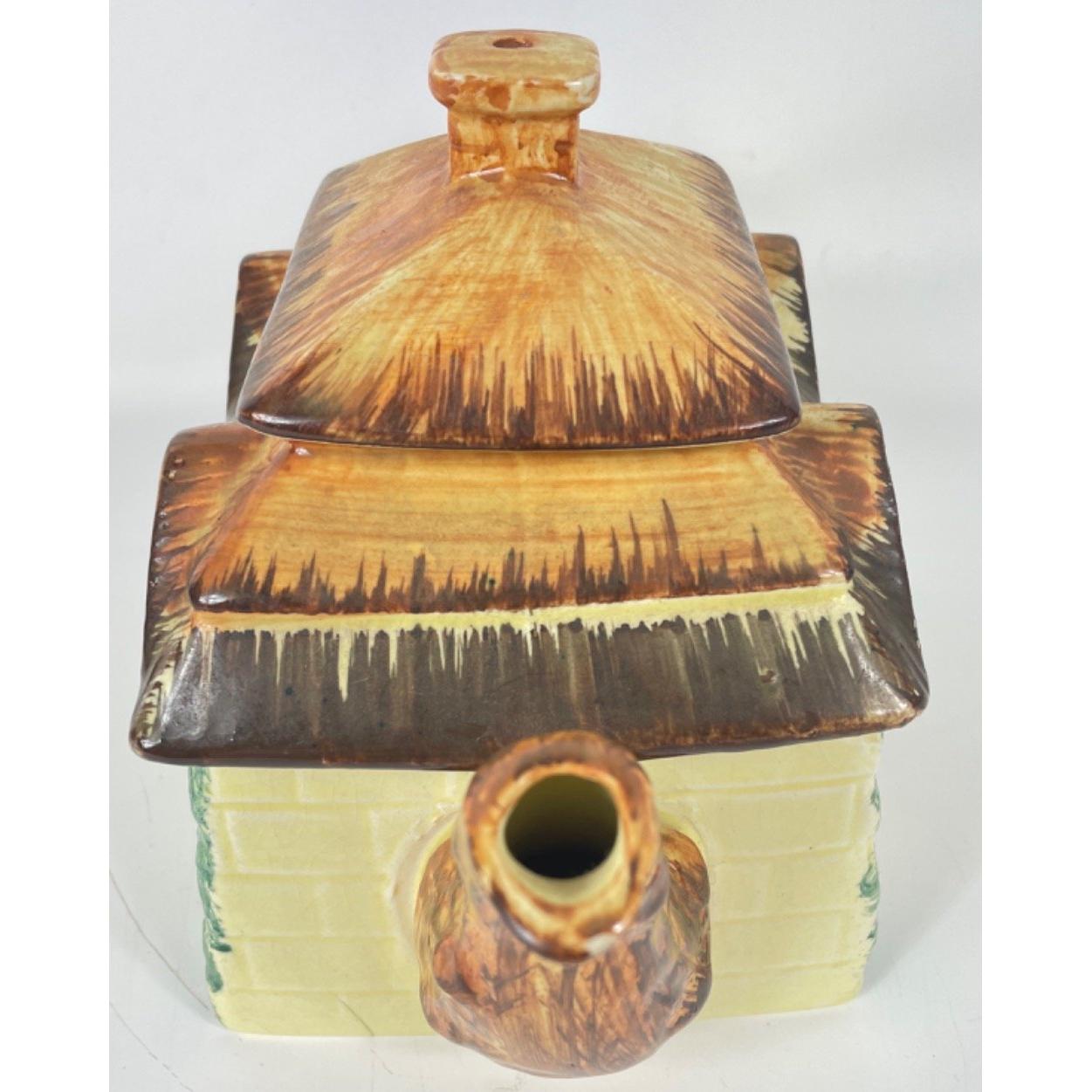 A KEELE STREET pottery teapot (16cm high with milk jug and sugar bowl, a SUVESCO goblin teapot (19cm high, broken arm) and coffee pot (21cm high), a trivet by T DEAN & SONS (13x13cm), and a small biscuit barrel with wicker handle (13cm high)