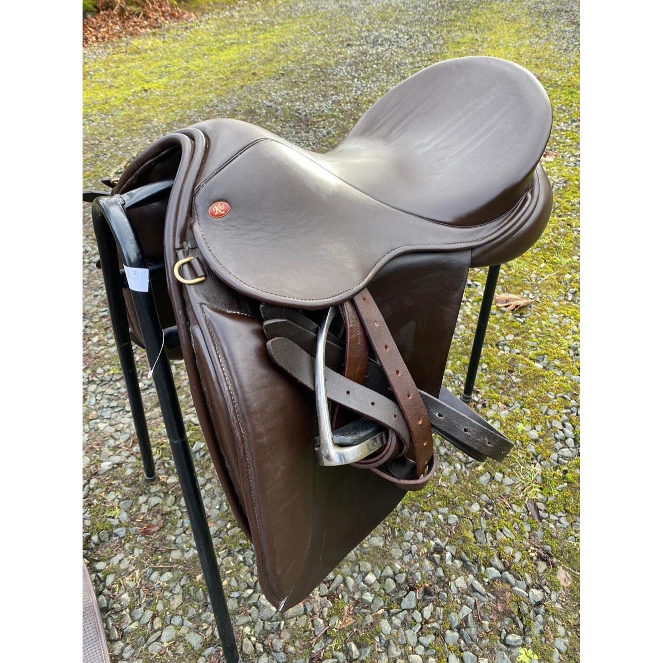 EQUESTRIAN INTEREST - A 17" (5.5/6" at the pommel) KES handmade brown leather (oiled and maintained) DRESSAGE saddle (cost new £800) complete with stirrups and leathers,
