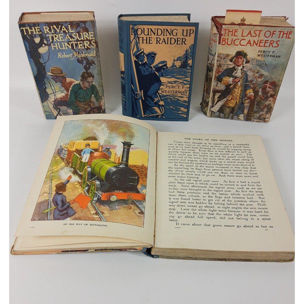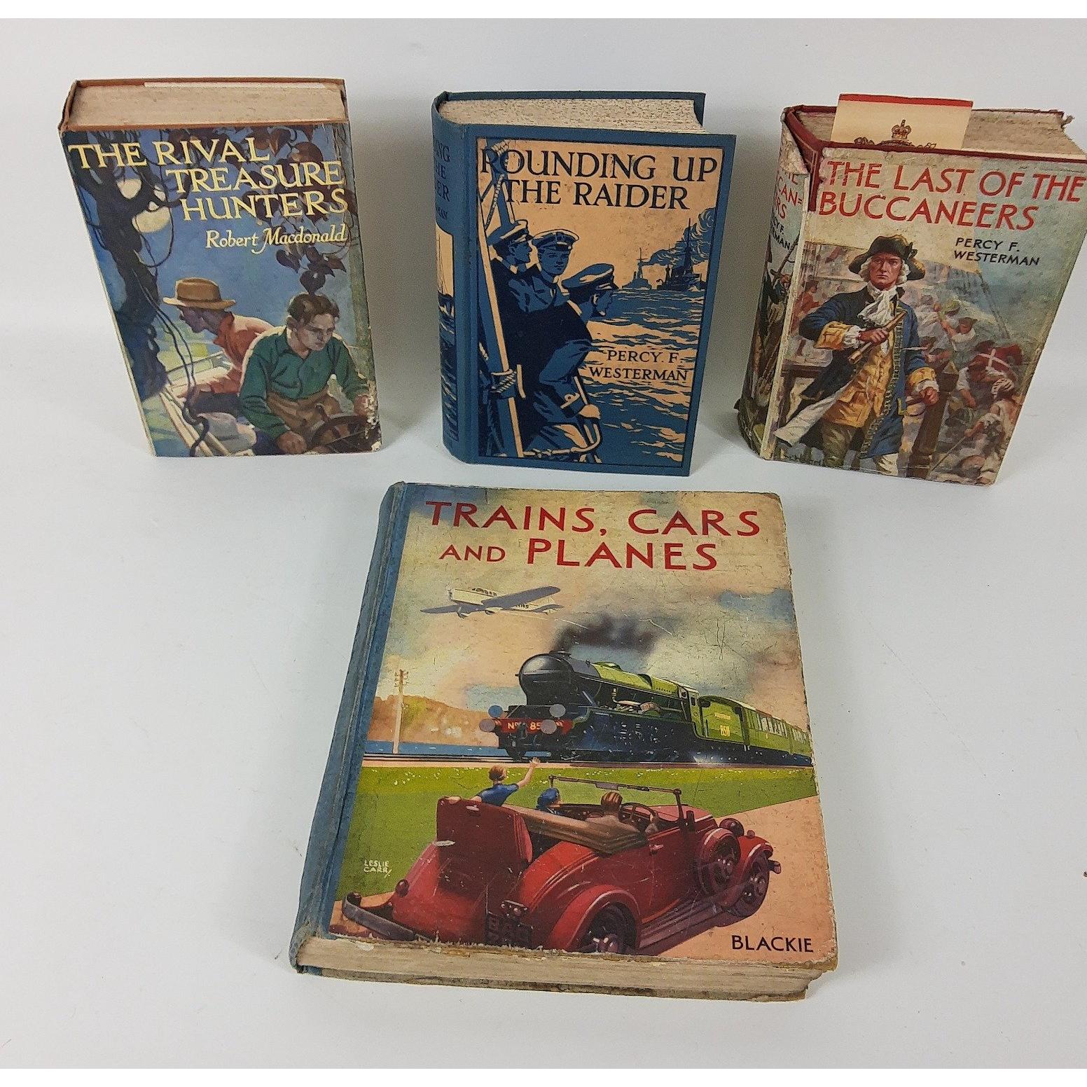 A collection of vintage books to include a first edition (1920s) TRAINS, CARS AND PLANES by GG Jackson with colour illustrations, in fair condition with no loose pages, two boys adventure books by PERCY F WESTERMAN -The Last of the Buccaneers with dust jacket, and Rounding up the Raider, no dust jacket plus The Rival Treasure Hunters by ROBERT MACDONALD with dust jacket plus a BOOKMARK with a quotation from King George Vl's Christmas message in 1940 (The future will be hard, but our feet are planted on the path of victory and with the help of God we shall make our way to justice and to peace)