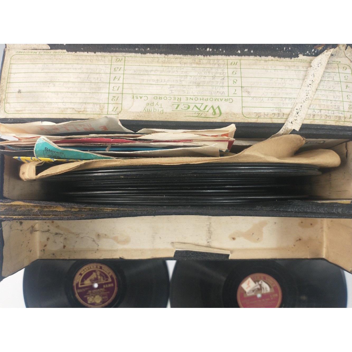 A vintage record carry case filled with vintage 78s including such classics as 'I think I'll get wed in the Summer' sung by Harry Lauder plus various 45 singlesApprox 1 pieces