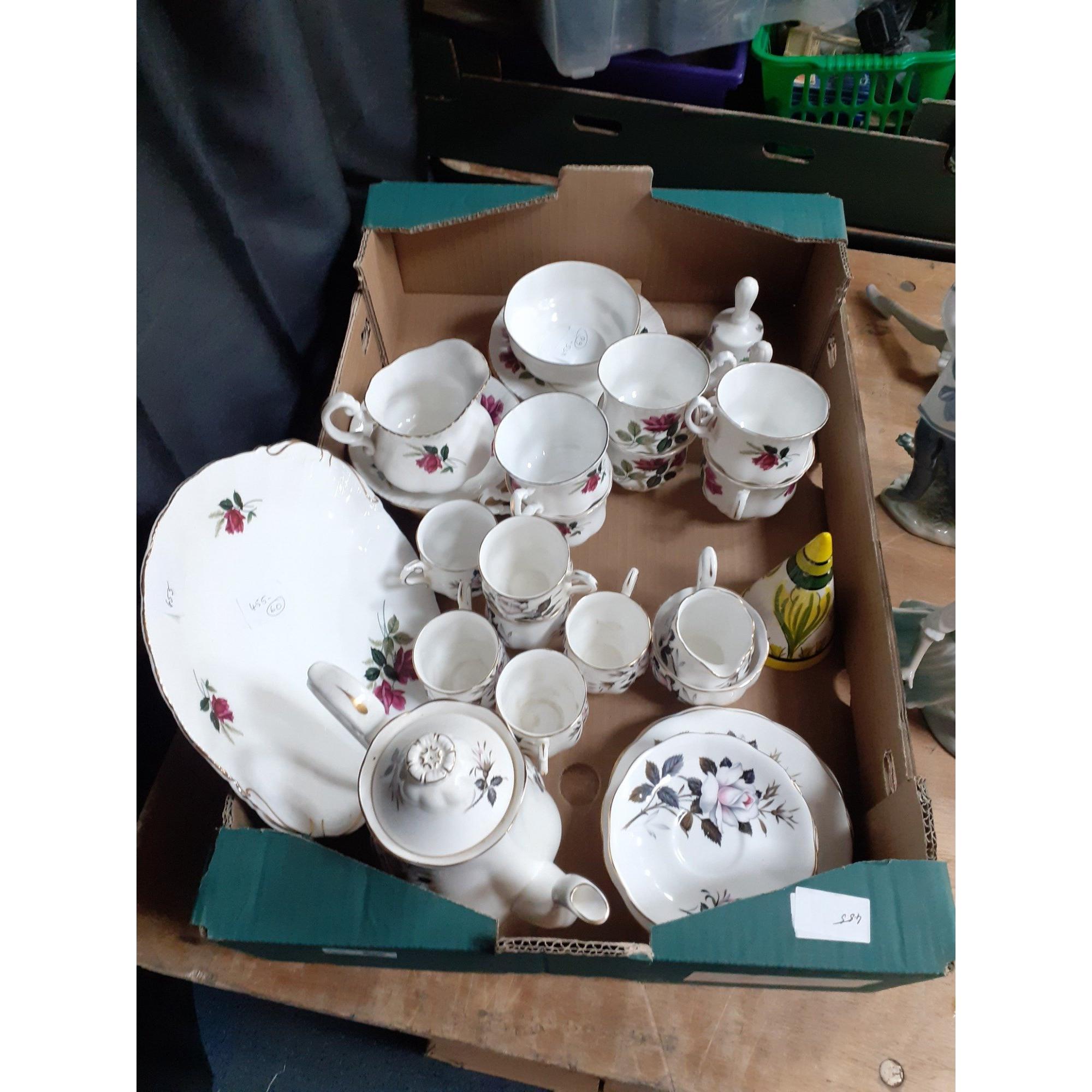 A ROYAL ALBERT coffee set in the QUEEN'S MESSENGER pattern comprising 6 cups, 6 saucers (12.5cm), 6 plates (16cm), 1 creamer, 1 sugar bowl, 1 coffeepot, plus 1 bone china tea service (no maker's name) to include 6 cups, 6 saucers (14cm), 6 plates (16cm), 1 milk jug, 1 sugar bowl, 1 sandwich plate (26.5cm), also a CROWN DEVON sugar shaker 'Crocuses' hand-painted by Dorothy Ann (14cm high), and 2 HIGHLAND CHINA bells (11cm high)
