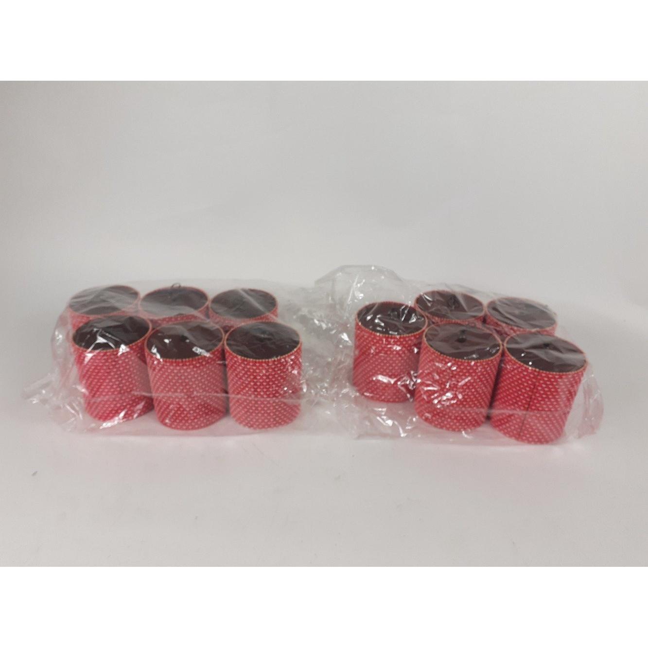 Eleven red wooden storage canisters 9cm tall, 8cm dia