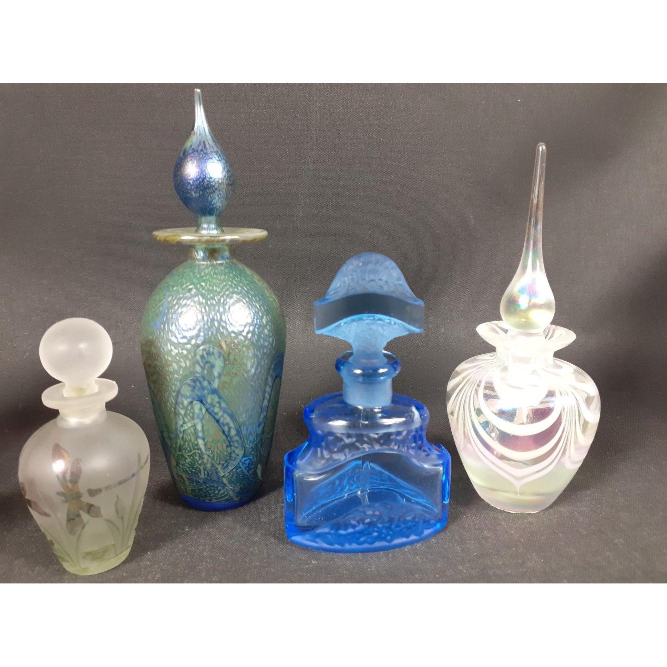 A collection of three fragile Middle Eastern glass perfume bottles, the tallest being 17cm high approx, plus some more substantial bottles from VILLAGE GLASS (13cm), DARTINGTON (11cm), a JENNY BLAIR bottle with a dragonfly design (9cm tall approx), a rainbow MURANO bottle (11cm tall approx), a TOUCH OF GLASS (18cm tall) and a small blue vase hand-made in Cyprus with a silver-plate overlay (11cm tall approx) etc