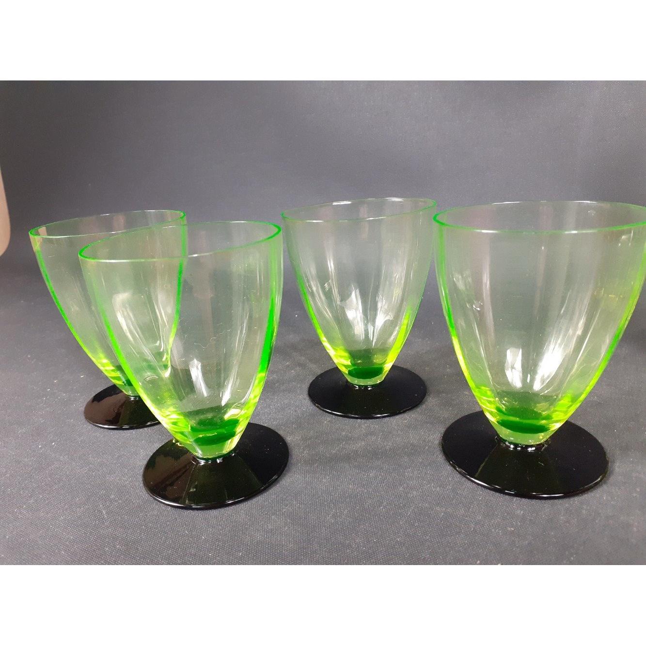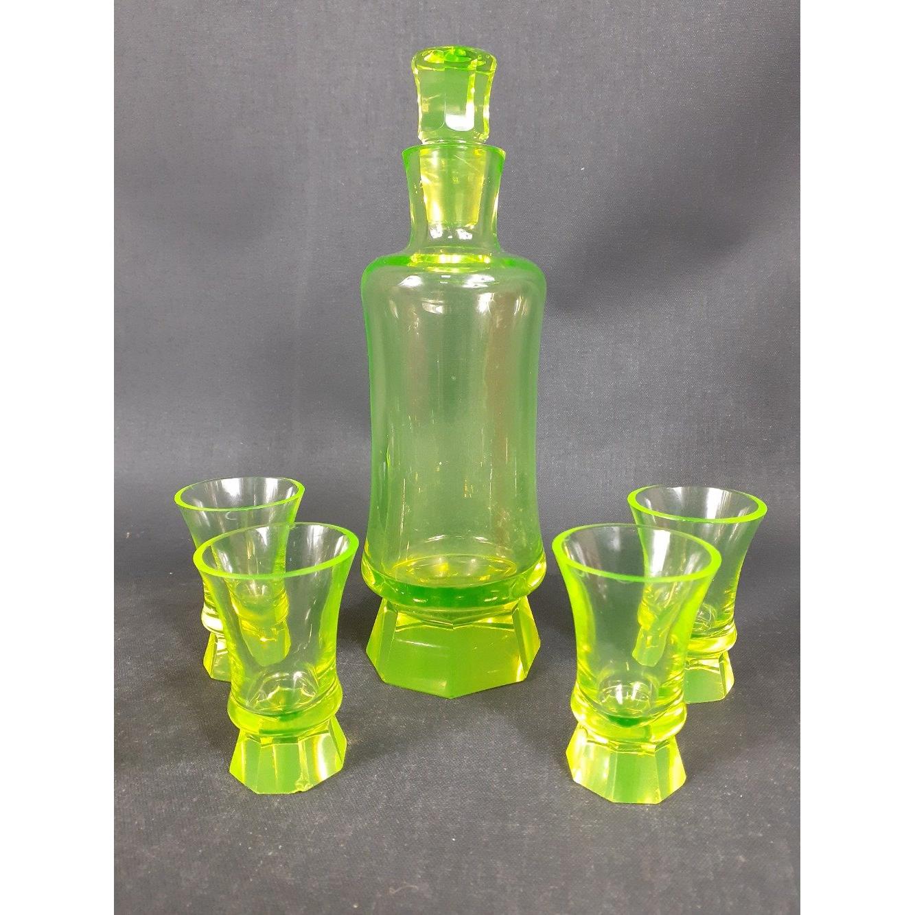 Vintage URANIUM glass to include a small decanter (21cm tall approx), 4 shot glasses and 4 sundae dishesApprox 9 pieces