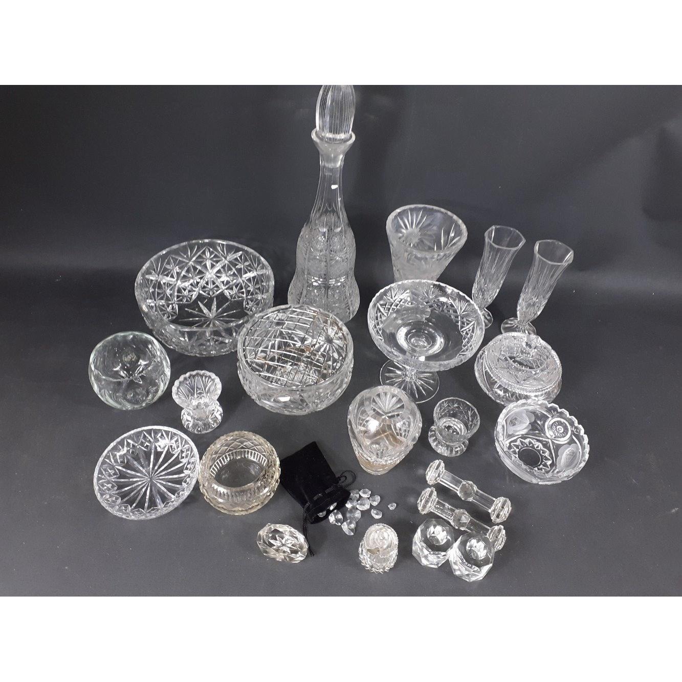 A mixed lot of glassware to include a fruit bowl (20cm dia), a rose bowl (15cm), a large decanter, candlesticks etc