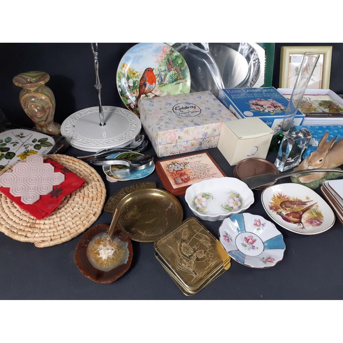 Box of KITCHENALIA. Many items to include coasters, flatware, trinkets and ornaments