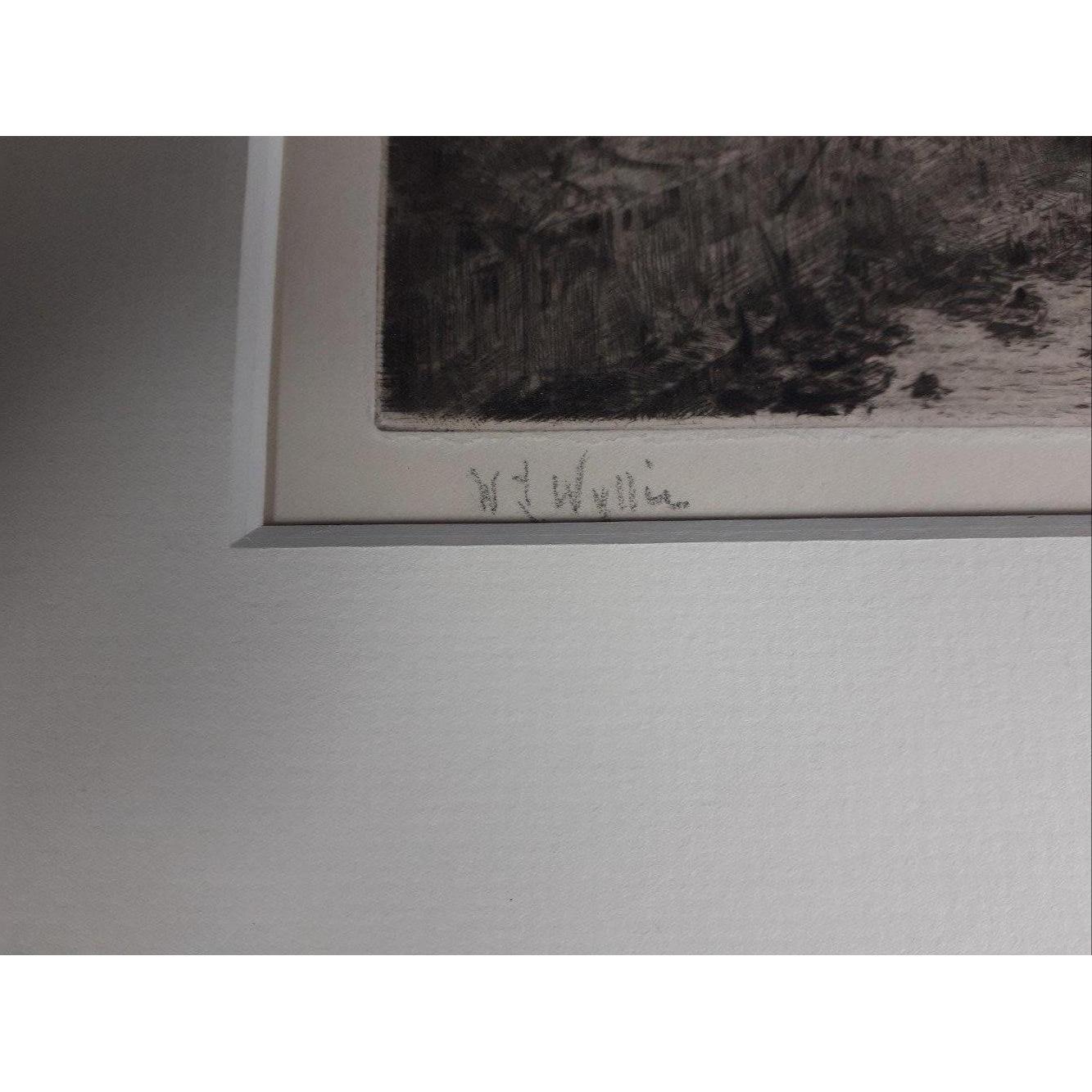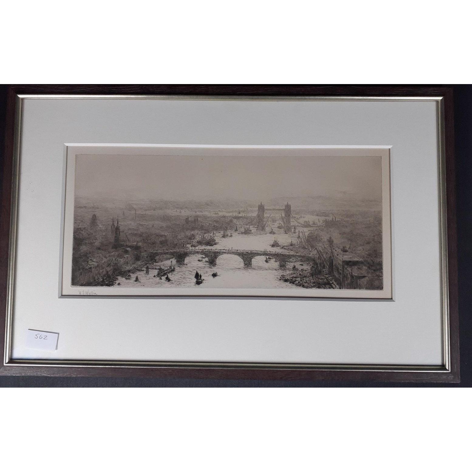 By WL WYLLIE (1851 – 1931), an etching on paper, signed in pencil by the artist, showing the building of Tower Bridge, London frame size 55x36cm,visible work 37x17cm. One of a set of three similar scenes by the artist always displayed together and offered for sale individually.