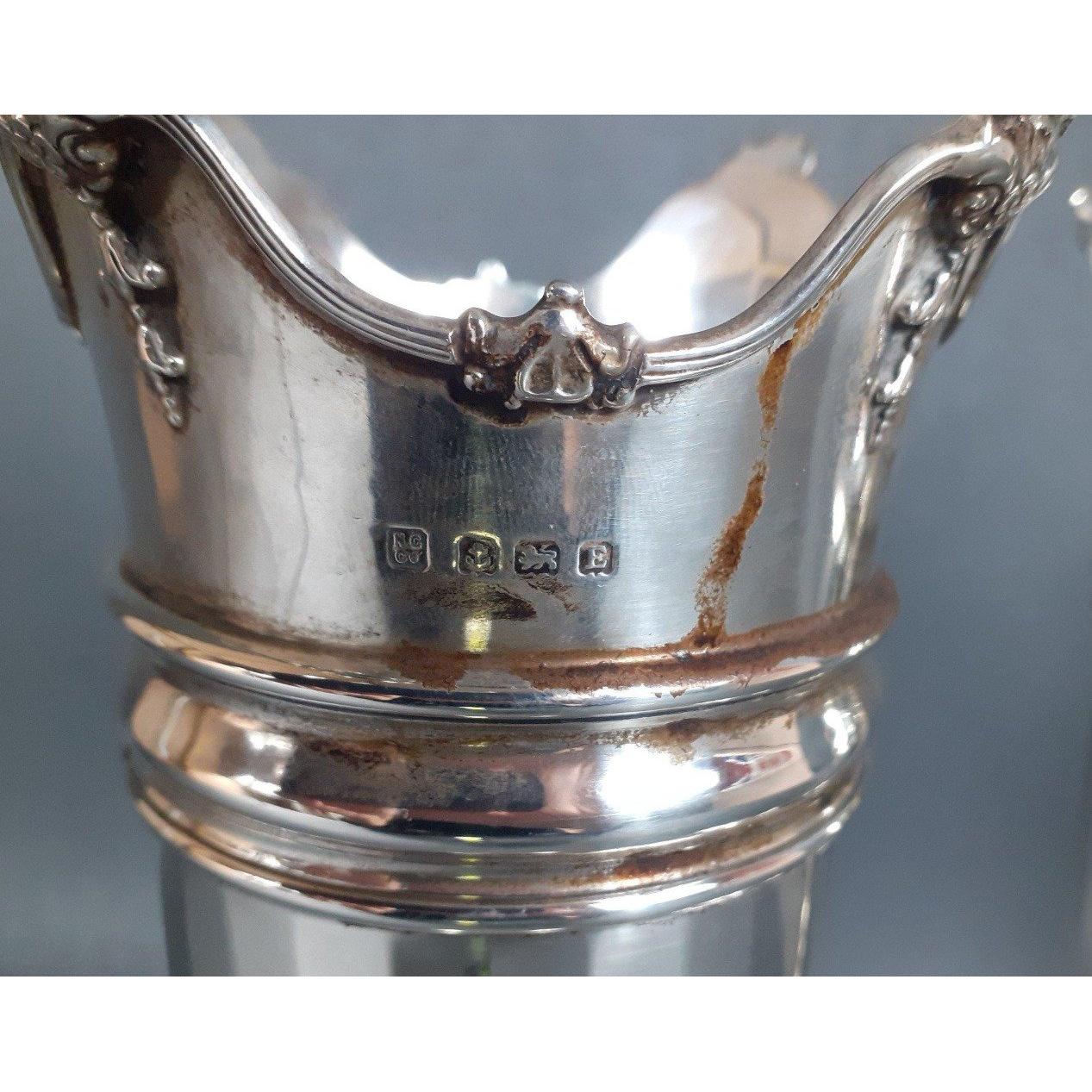 A stunning pair of silver vases with Birmingham hallmark 1929. Maker NG Co. 24cm tall approx with weighted wooden bases. Gross weight 960g approx.Approx 2 pieces