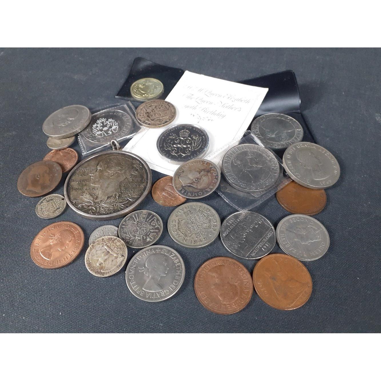 Assorted coins mostly UK including crowns and a large old head Queen Victoria base metal medallion in a mount.