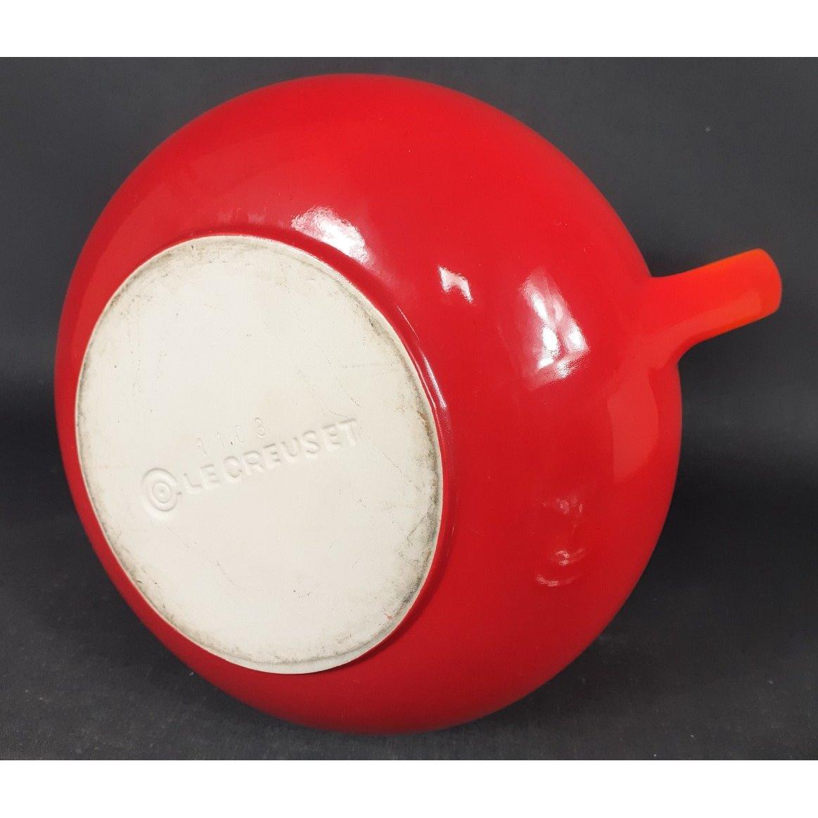 LE CREUSET volcanic orange stoneware casserole dish. Complete with lid and in good condition. 20cm across at neck approx. 16cm high without lid approx.