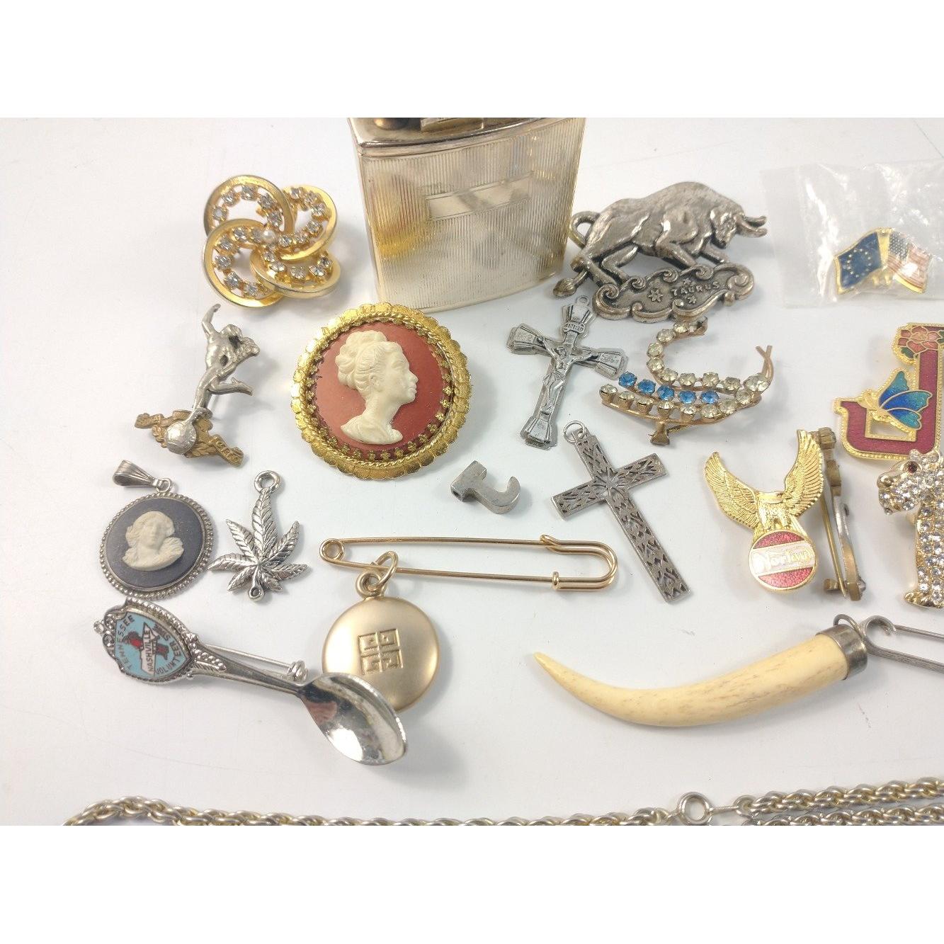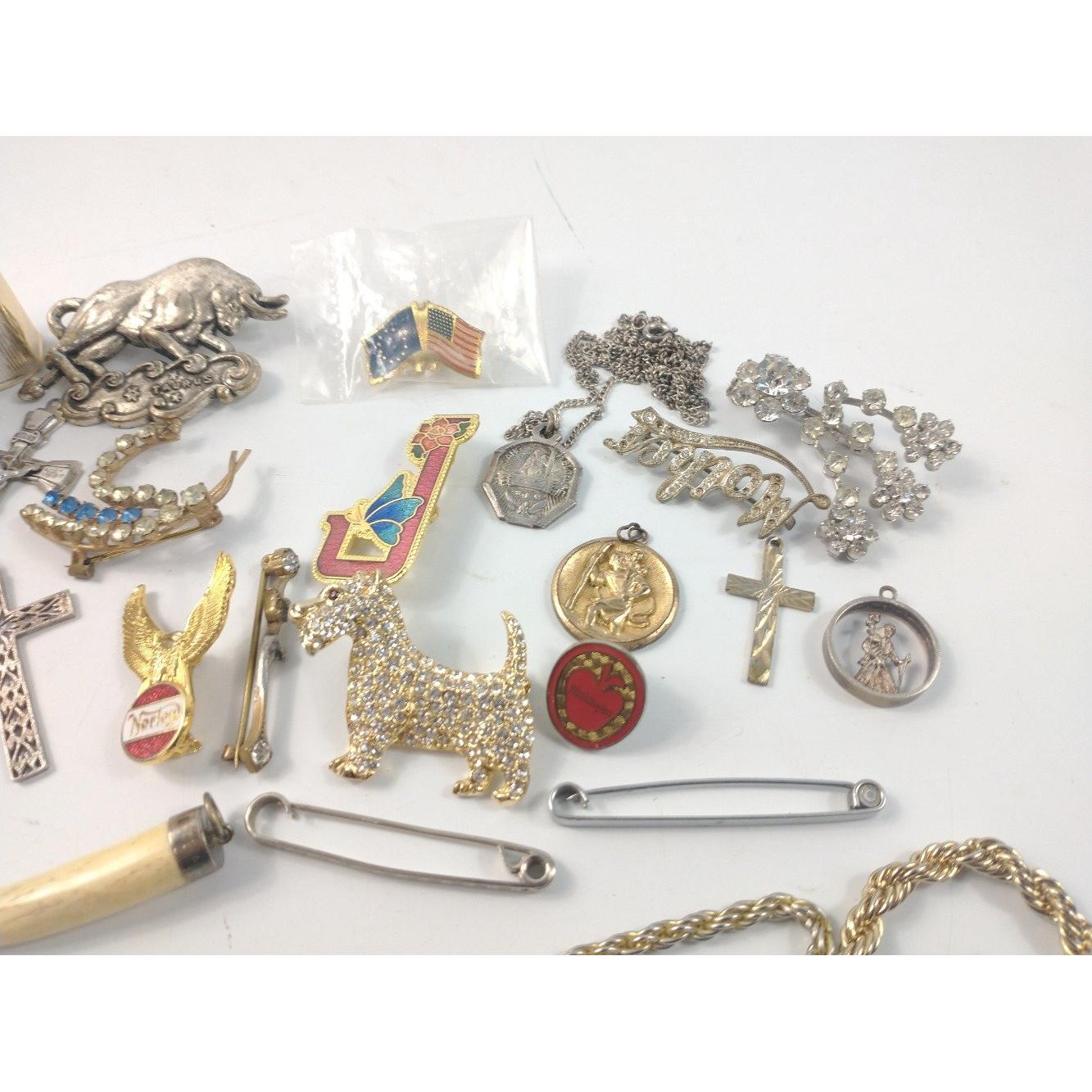 A bag of unmarked mixed jewellery to include brooches, chains, white metal cross pendants, a white metal BRUGGE pendant etc etc