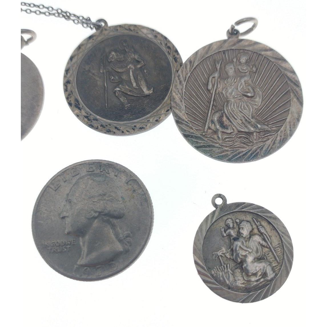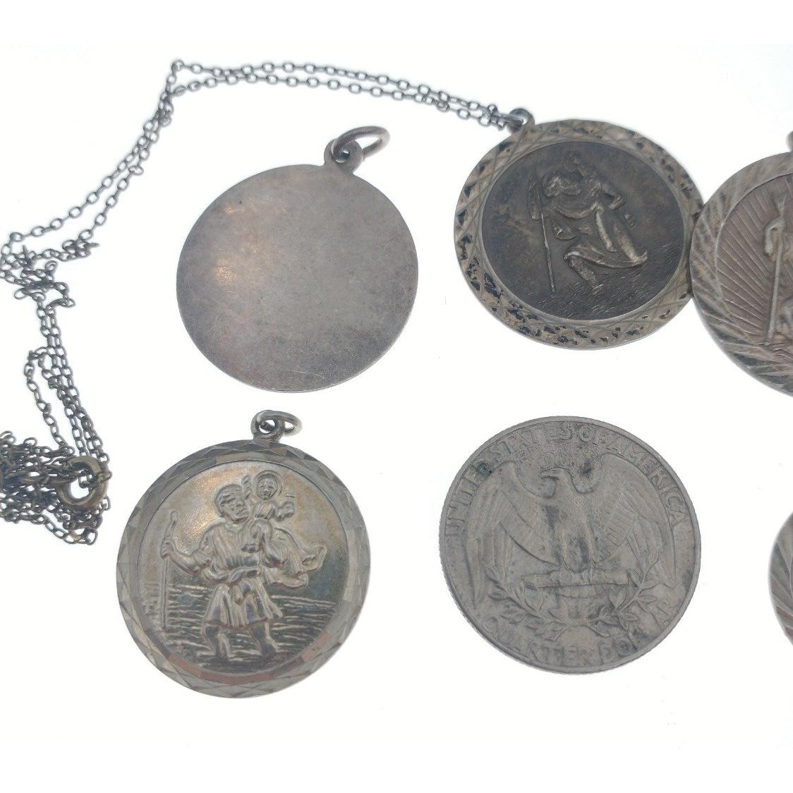 Four silver stamped St Christopher pendants (1.5 - 3cm dia) also with a silver stamped disc, a 1973 quarter dollar coin, silver weight 23.30g approxApprox 6 pieces