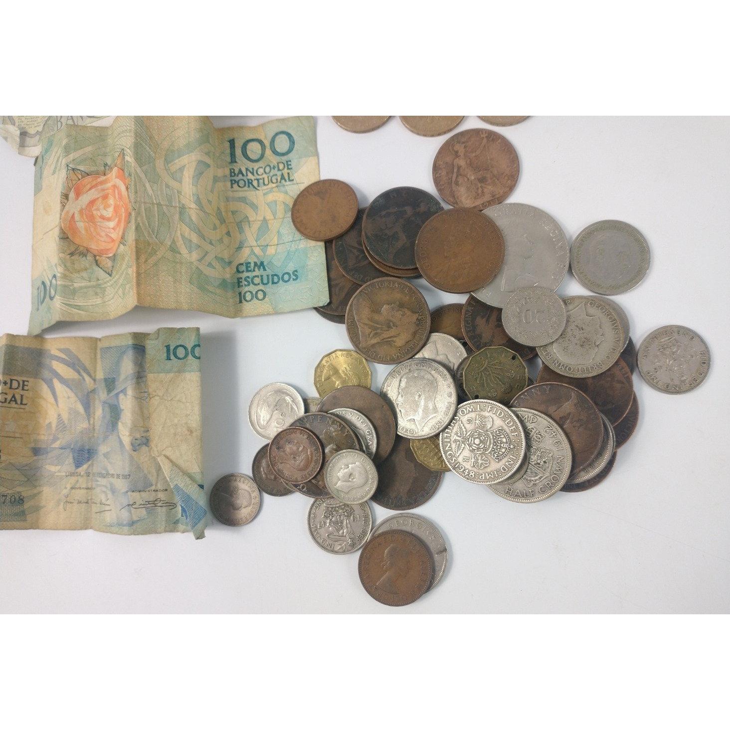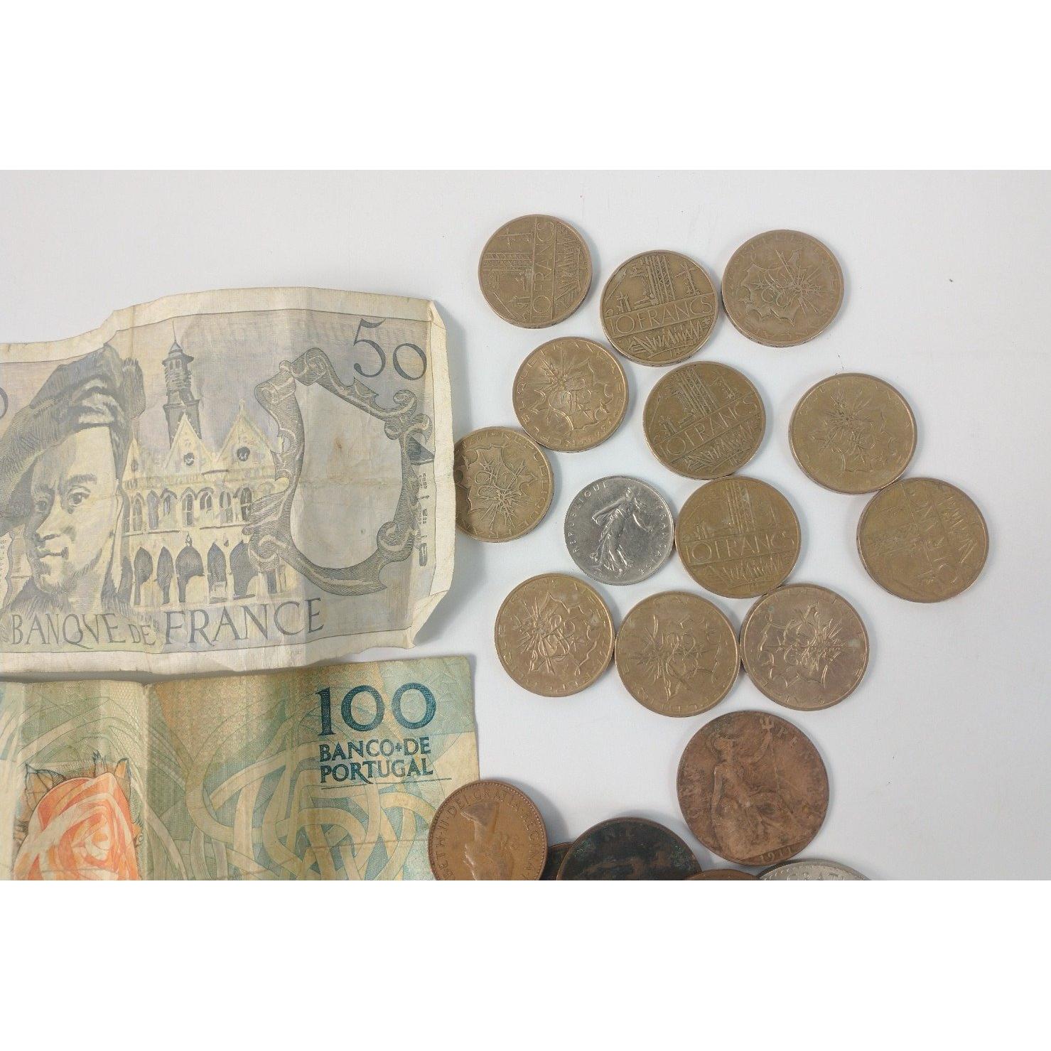 A 50 Franc Banknote 1982(corner edge torn and folded in several places) with twelve 10 Francs coins and a silver 1 franc coin , with also BRITISH coins to include also an 1834 William lV silver sixpence, vintage 20th century British coinage, two shilling coins, one Penny coins Victoria etc and Florin coins etc, also Two 100 Escudos bank notes(in used worn condition) etc