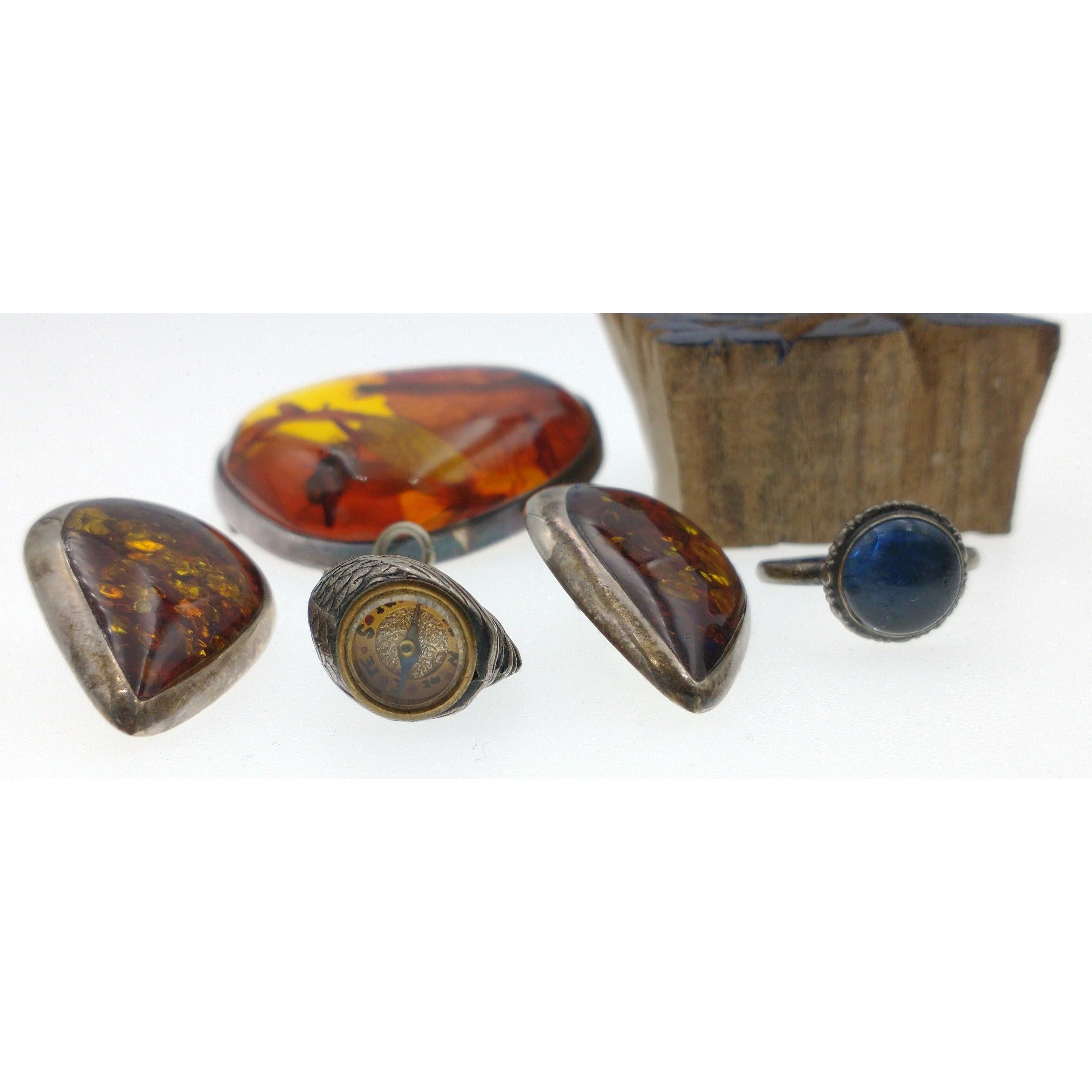 A small collection of 925 stamped amber/resin jewellery to include a pair of clip-on earrings (3cm long) and a pendant (4cm long), gross weight 23.50g plus a white metal cockerel pendant (3cm long) with a tiny compass in its base and a ring stamped Sterling with a blue stone Size K,