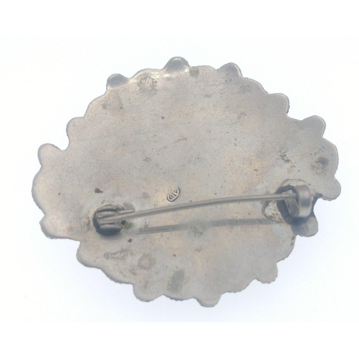 Unmarked 'white metal' stamped ALP beeded brooch with centred green cabochon style stone 13g gross - dimension 5cm x 4cm approx