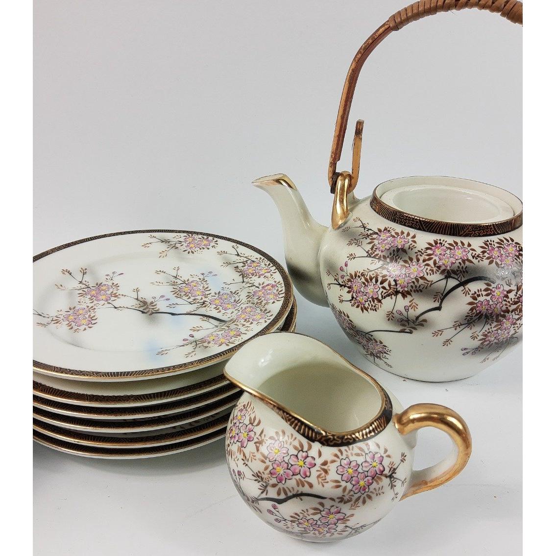 An Oriental spring blossom design eggshell tea service with geisha's face visible in base of cups comprising 6 cups (1 with hairline crack), 6 saucers (1 small chip, 1 crack repaired), 6 plates (17cm dia), 1 milk jug, 1 tea kettle with strainer but no lid, plus 4 red soup bowls, 3 with lids and six spoons