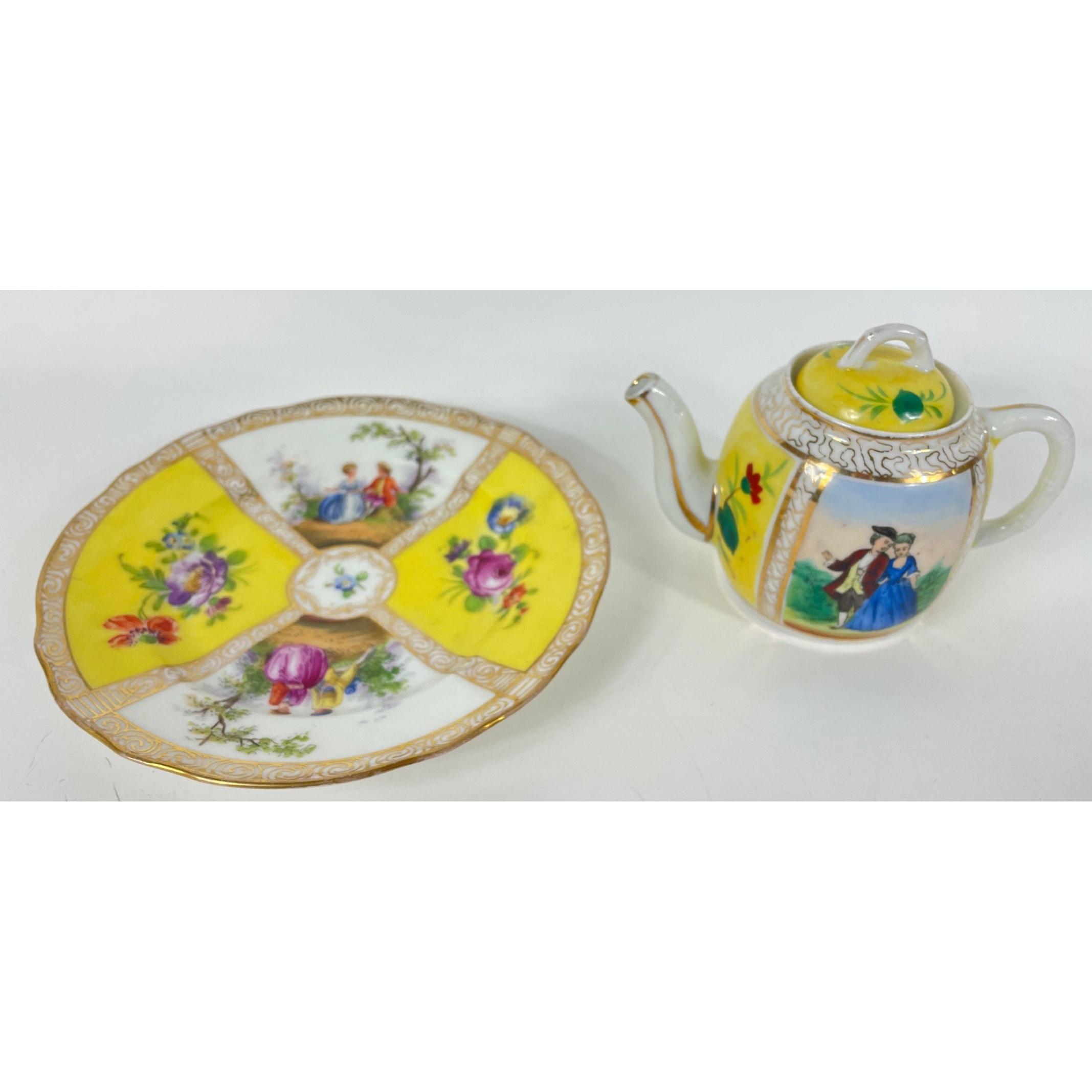 A PRETTY and stunning Richard Klemm miniature teapot and saucer, various figural scenes and floral displays with a centre medallion in the centre of the plate, plate has a slight chip on the foot, Dimensions - 6.1cm