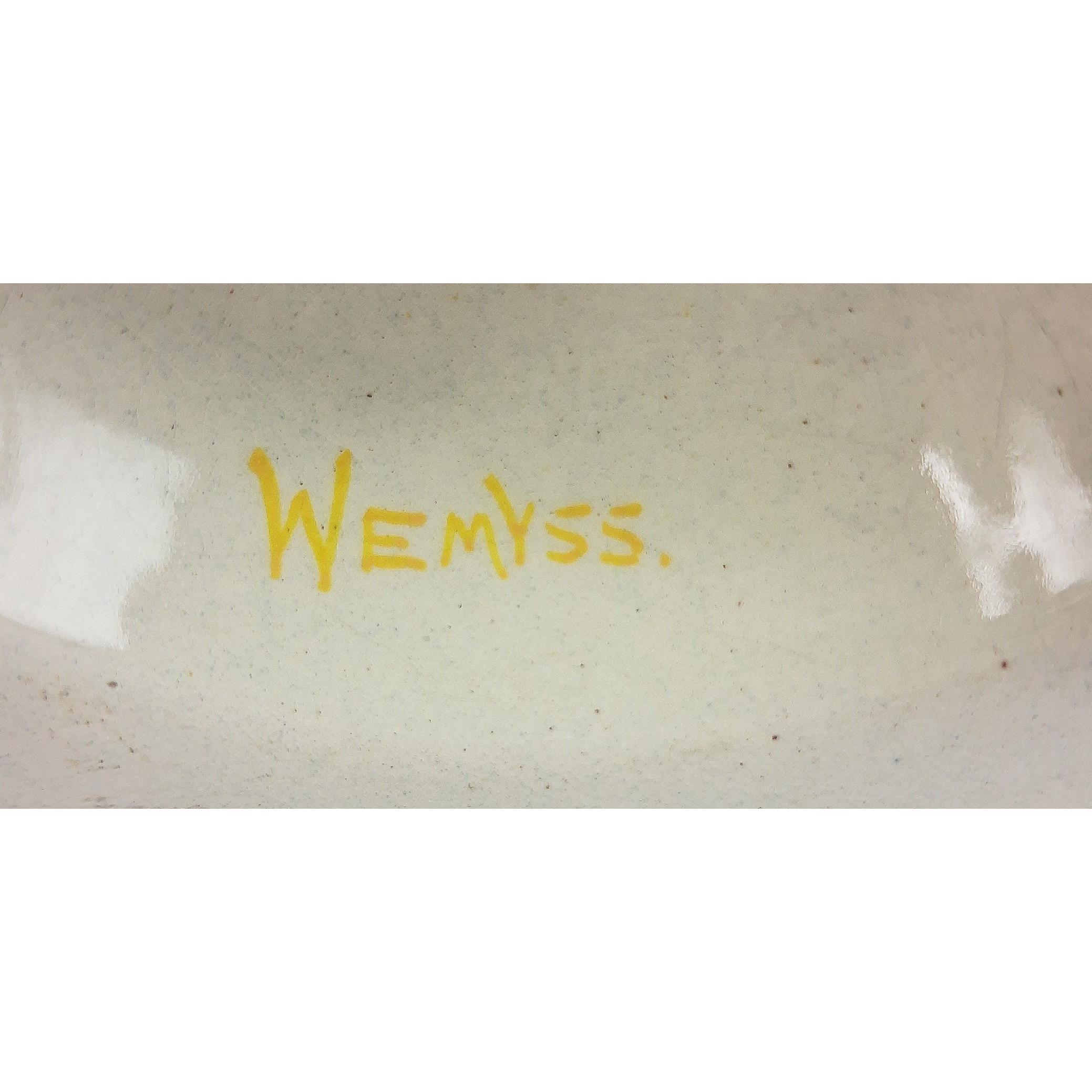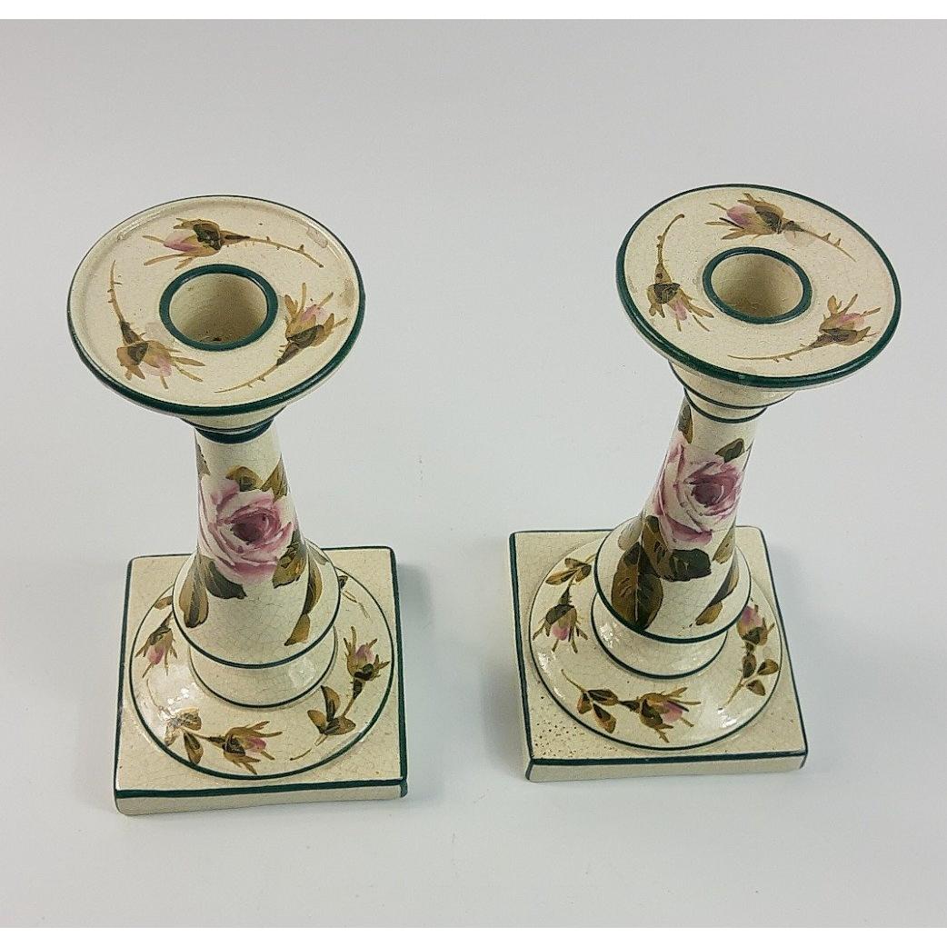 A pair of WEMYSS ware candle sticks, rose and briar leaf decoration, standing 18cm tallApprox 2 pieces