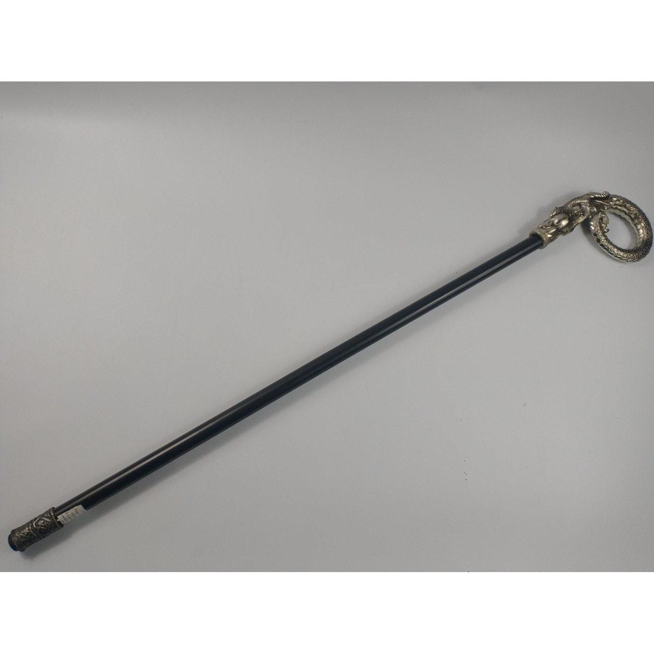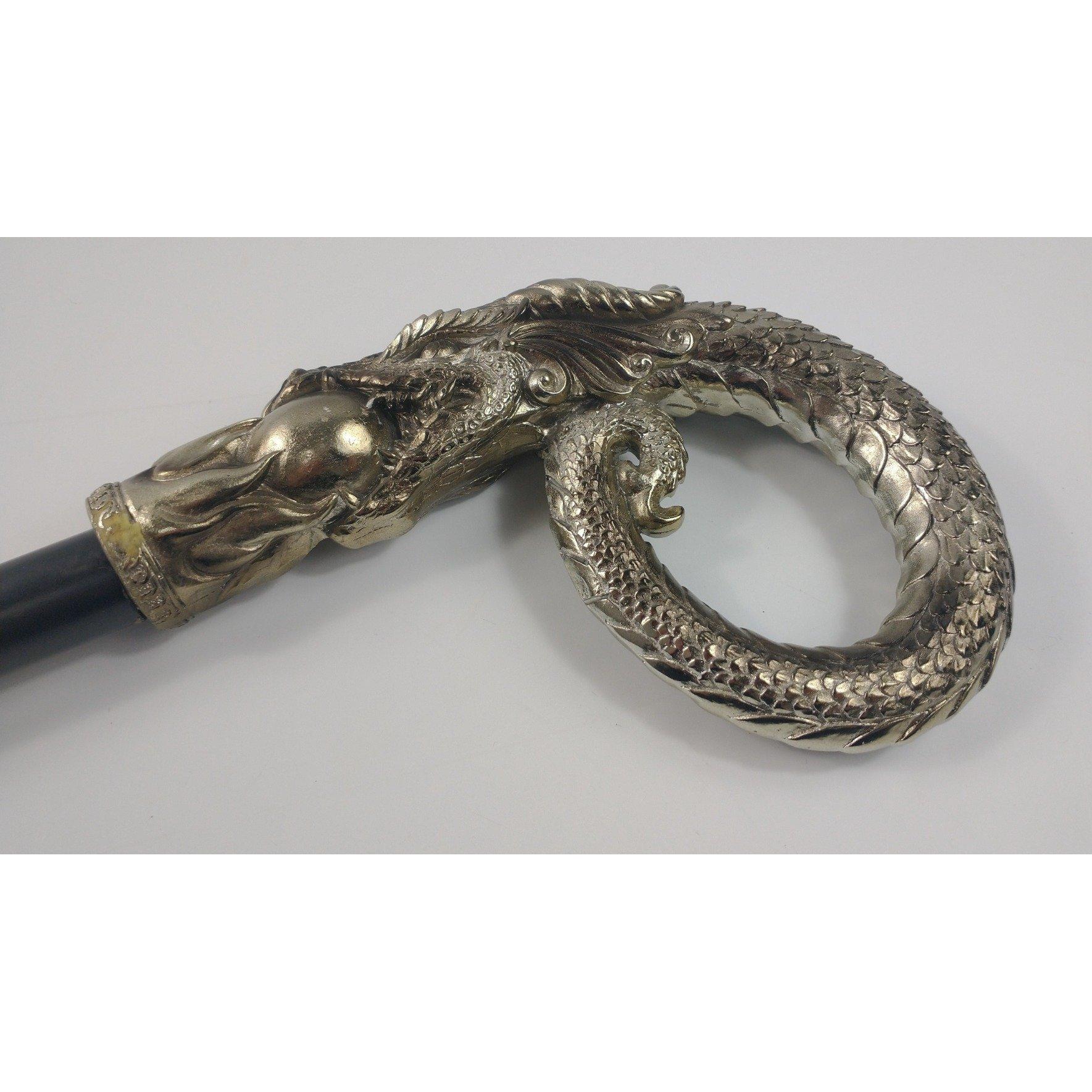 A truly splendiferous swaggering cane, with a white metal dragon biting down on an orb, 98cm long, NOT for use as a walking stickApprox 1 pieces