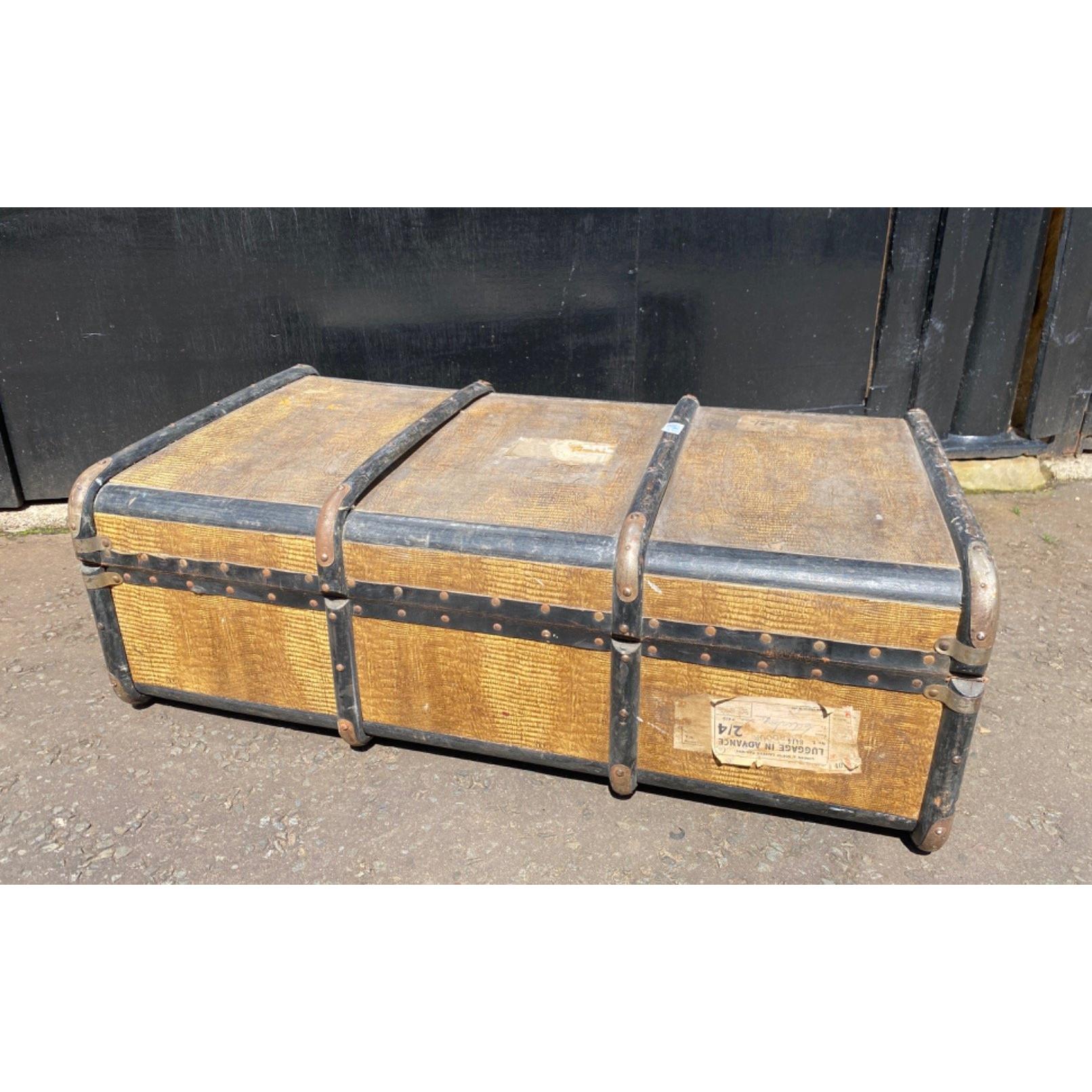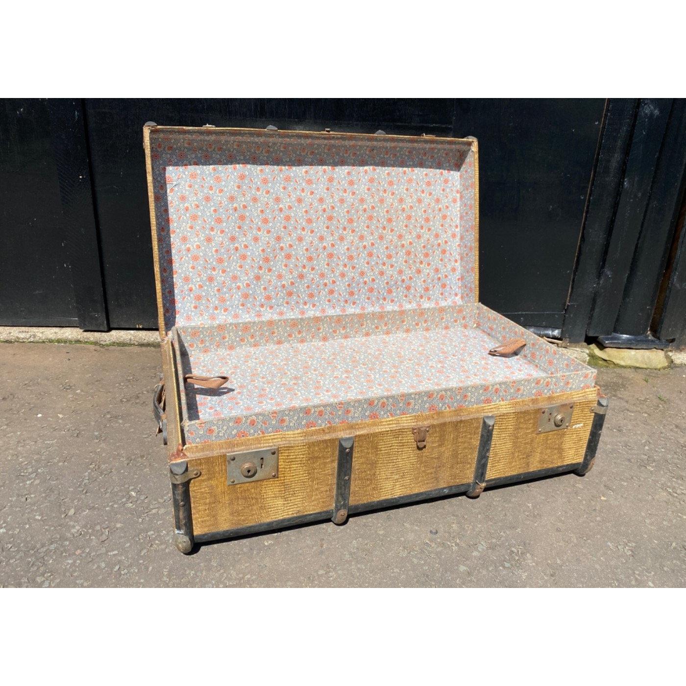 A vintage trunk (90Lx 30Hx53Dcm) with mock crocodile skin cover, wooden bands and white metal edging, complete with vintage railway luggage labels from the London and North East Railway and initials D.G>