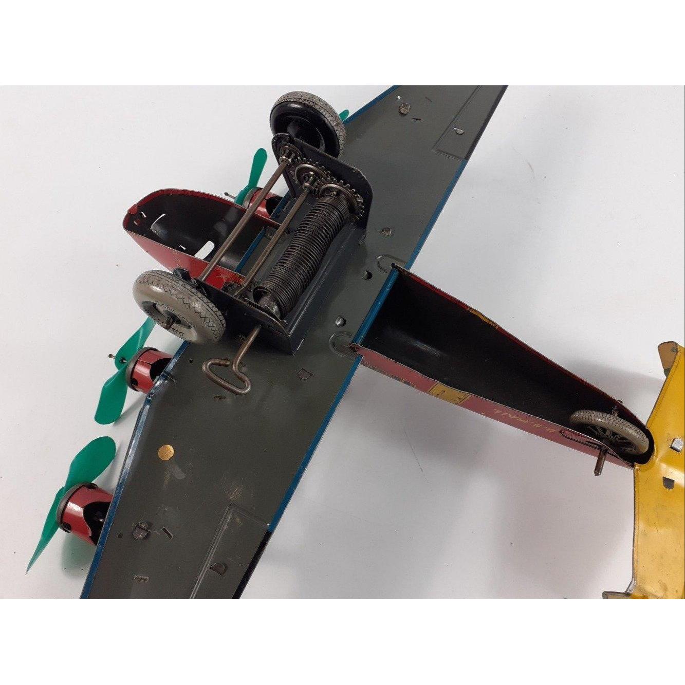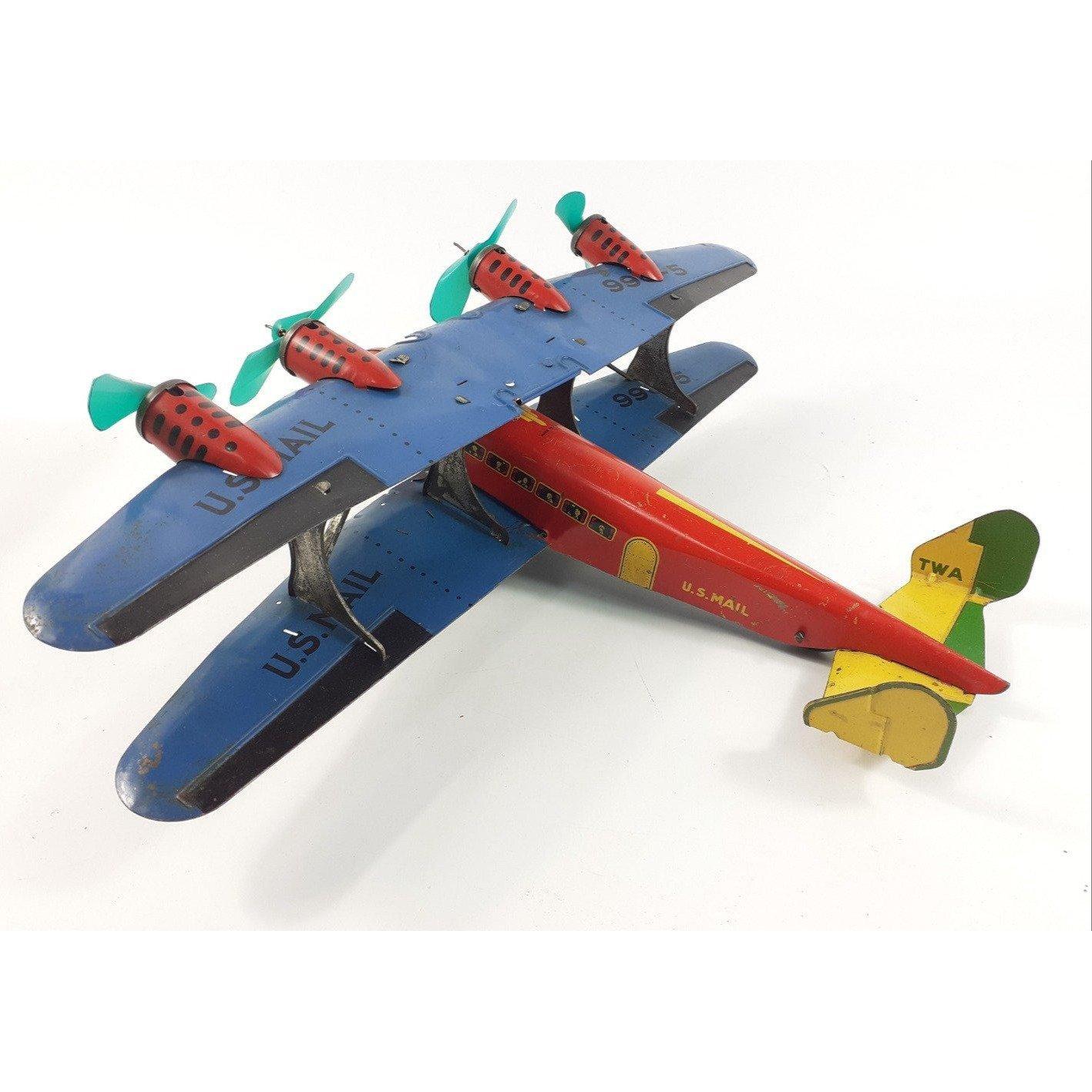 RARE! A superb rare 1930s original American tinplate biplane with clockwork motor in working order. Made by Marx and carrying TWA US Mail livery in unusual colour scheme. There is no rusting to the finish and the model is in remarkable condition for its almost 100 years. 30 cm in length with a 48cm wingspan this is a very sought after and rare item.