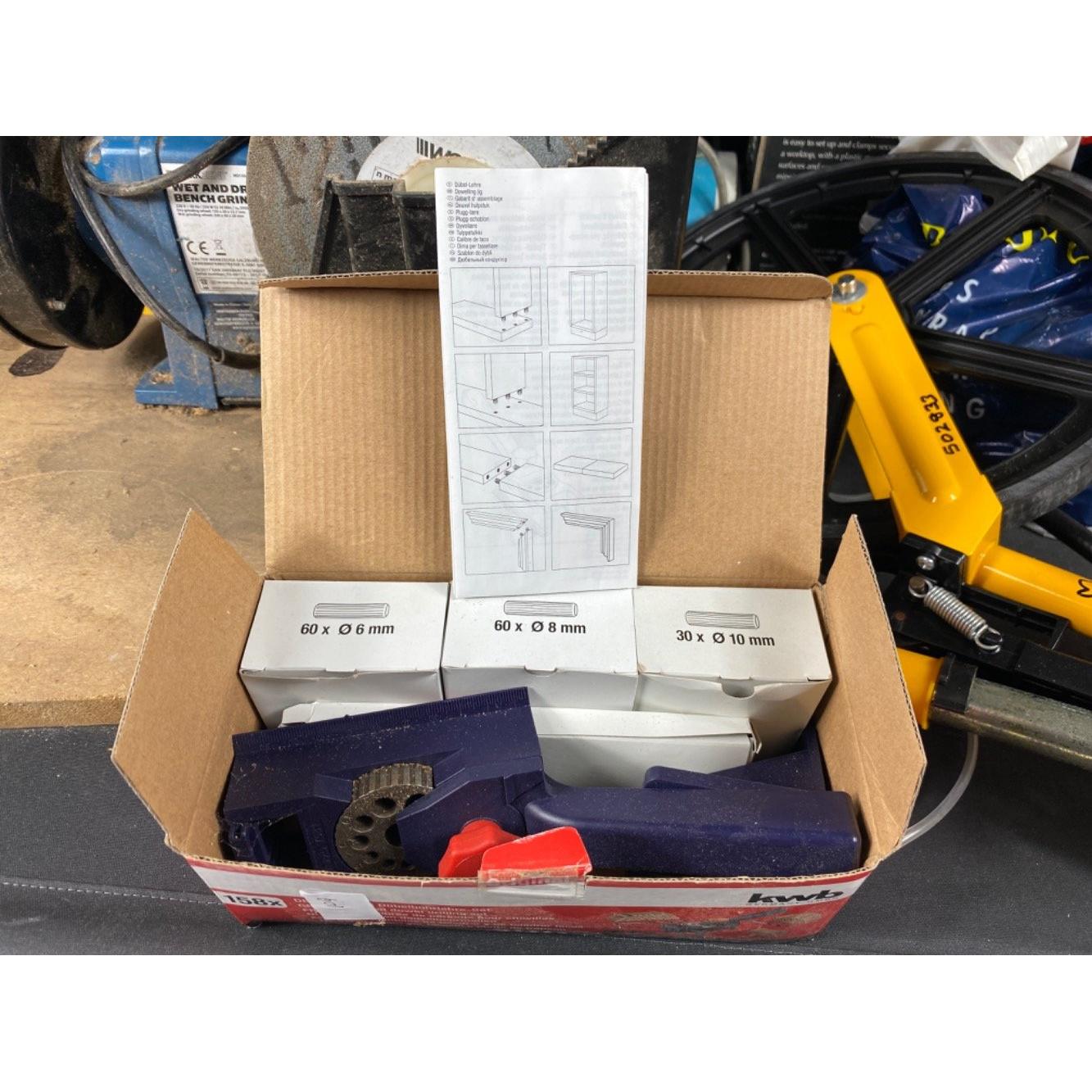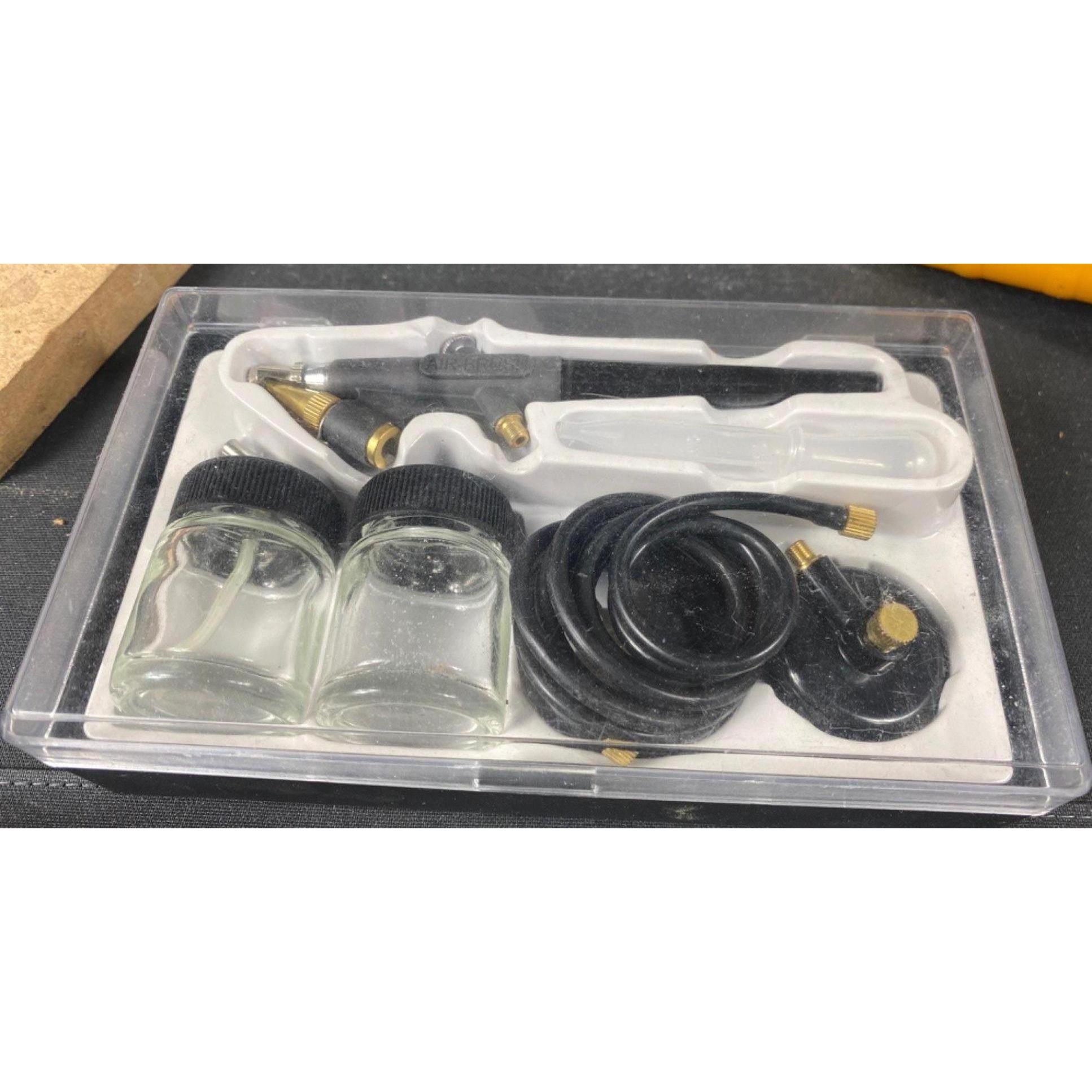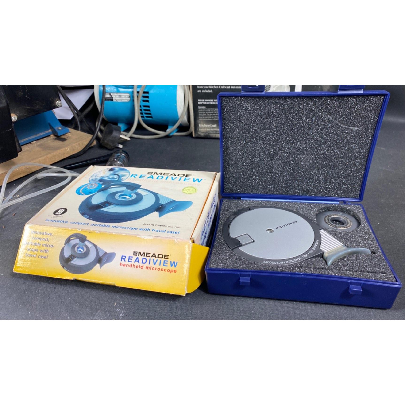 An extensive lot of tools to include a Kitchen Craft Italian Collection Cast Iron Mincer, 30cm high, an air brush set, a MEADE Readview handheld microscope in box, a KWB Germany GMBH drill set with instructions, a Trumeter road measuring device in case and a Work Zone sander on wooden base, 42cm long x 37cm wide. Condition - all in used/fair condition.