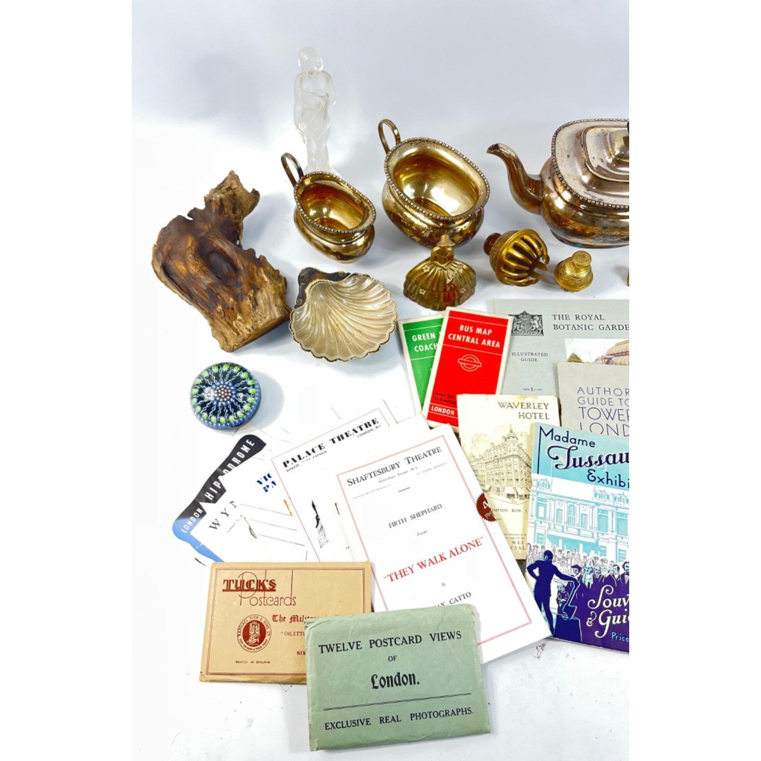 A mixed box to include a PERTHSHIRE MILLEFIORI Paperweight, a pack of 6 TUCK'S POST CARDS of the Military in London (post card no 5318) from the Tuck's Oilette Series in the original envelope, a set of 12 Valentine's postcard views of London in original envelope, a collection of various London theatre programmes from 1939, 2 London Transport maps of bus routes 1939, an EPNS tea service, a ROYAL COPENHAGEN Rosenborg Castle flagon (25cm high), 5 Copeland Spode plates, etc