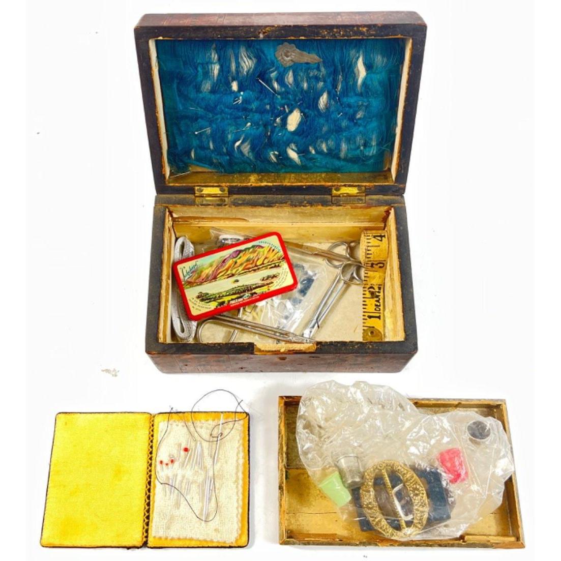 Five decorated wooden boxes of various sizes to include one used as a sewing box complete with haberdashery contentsApprox 5 pieces