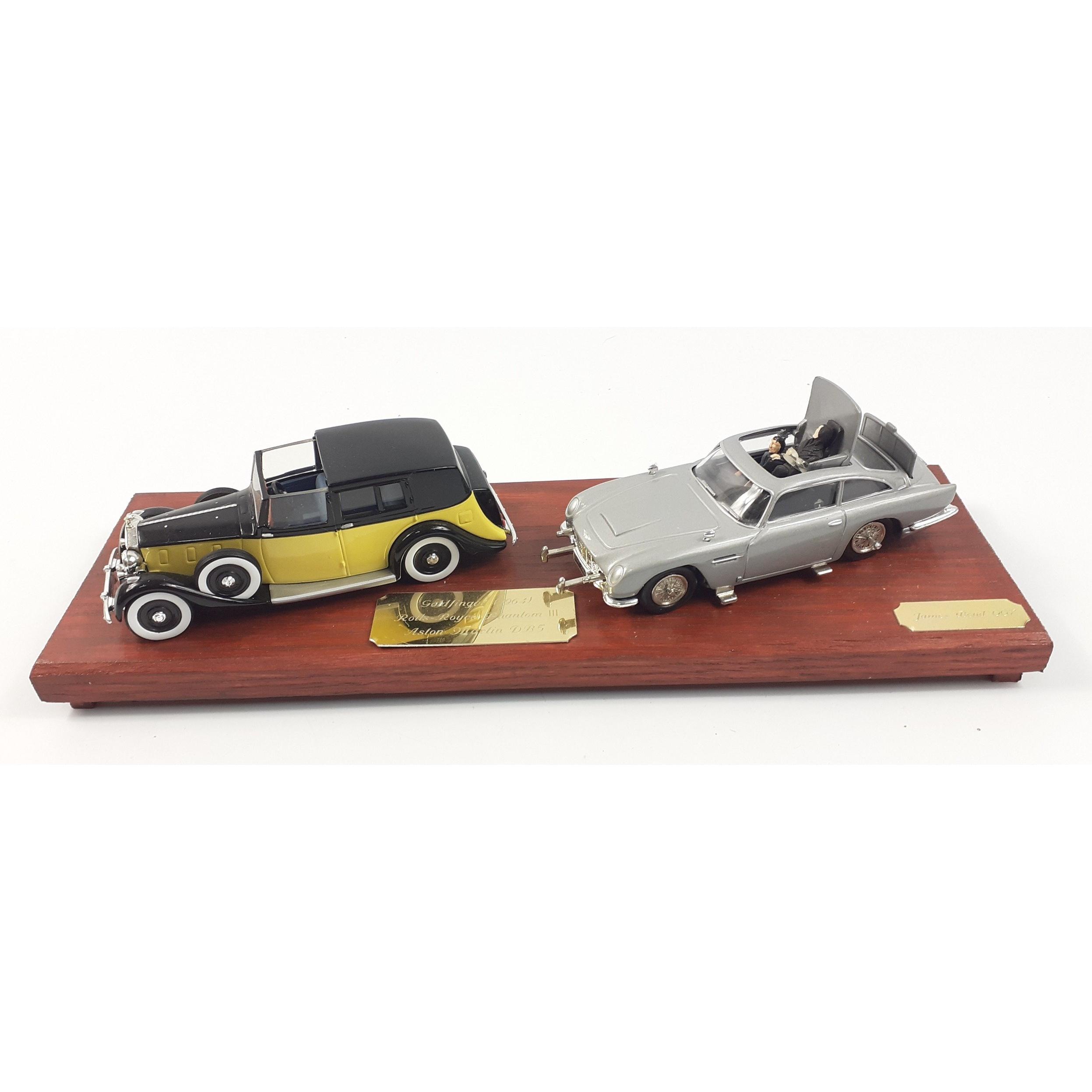 JAMES BOND - cars mounted on a wooden plinth to include from Die Another Day Aston Martin V12 Vanquish Jaguar XKR, a Goldfinger Rolls-Royce Phantom III with Oddjob figure and an Aston Martin DB5 complete with semi-ejected figure, a Goldeneye BMW Z3 Roadster, Tomorrow Never Dies BMW750il and The World is Not Enough BMW Z8 Roadster