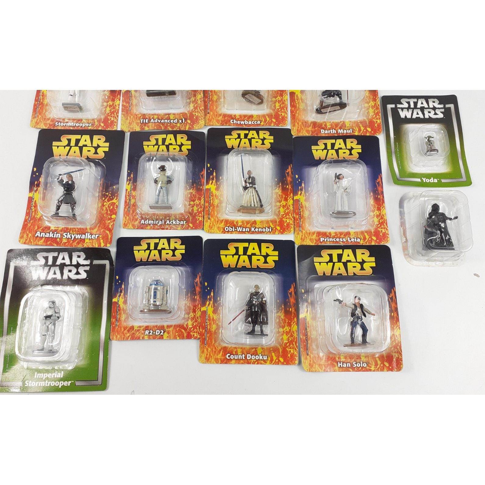STAR WARS - a collection of DE AGOSTINI blister pack hand-painted figurines to include: Yoda, Luke Skywalker, Obi-Wan Kenobi, C-3PO, R2-D2, Princess Leia, Han Solo, Chewbacca, Count Dooku, Boba Flett, Admiral Ackbar, Darth Maul, Grand Moff Tarkin, Anakin Skywalker, Imperial Stormtrooper, Stormtrooper, TIE Advanced x1 and Darth Vader (minus cardboard backing)