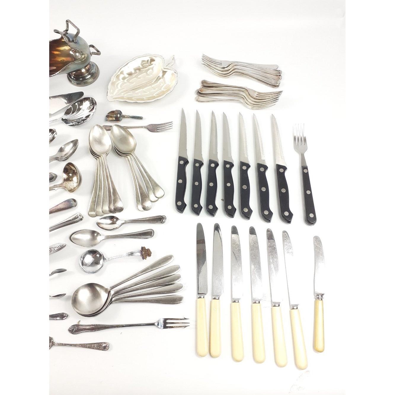 A box lot of large amount of cutlery to include teaspoons, forks, knives, steak knives, a plated sugar shaker and lots more!