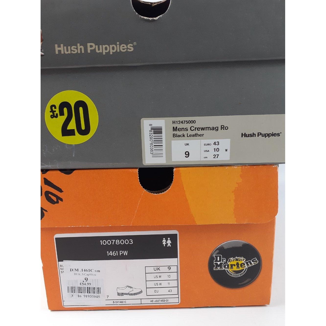 Two pairs of shoes for men including DR MARTENS AIR WAIR size 9 black lace-ups, never worn and a pair of HUSH PUPPIES size 9 black lace-ups, scarcely worn, Approx 2 pieces