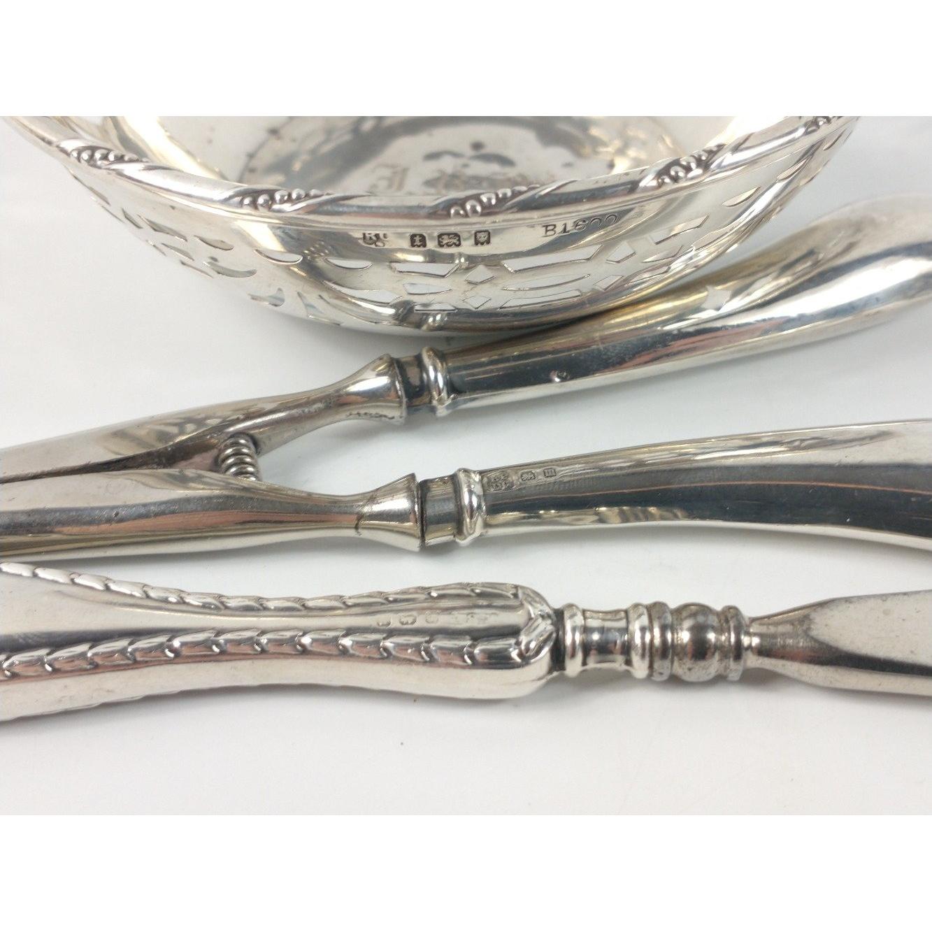 An interesting small silver lot comprising: Solid silver bowl London 1934 80g gross weight approx, a Silver lidded glass tray Birmingham 1901 lid only approx 90g, a silver handled shoe horn and a pair of silver handled glove stretchers.