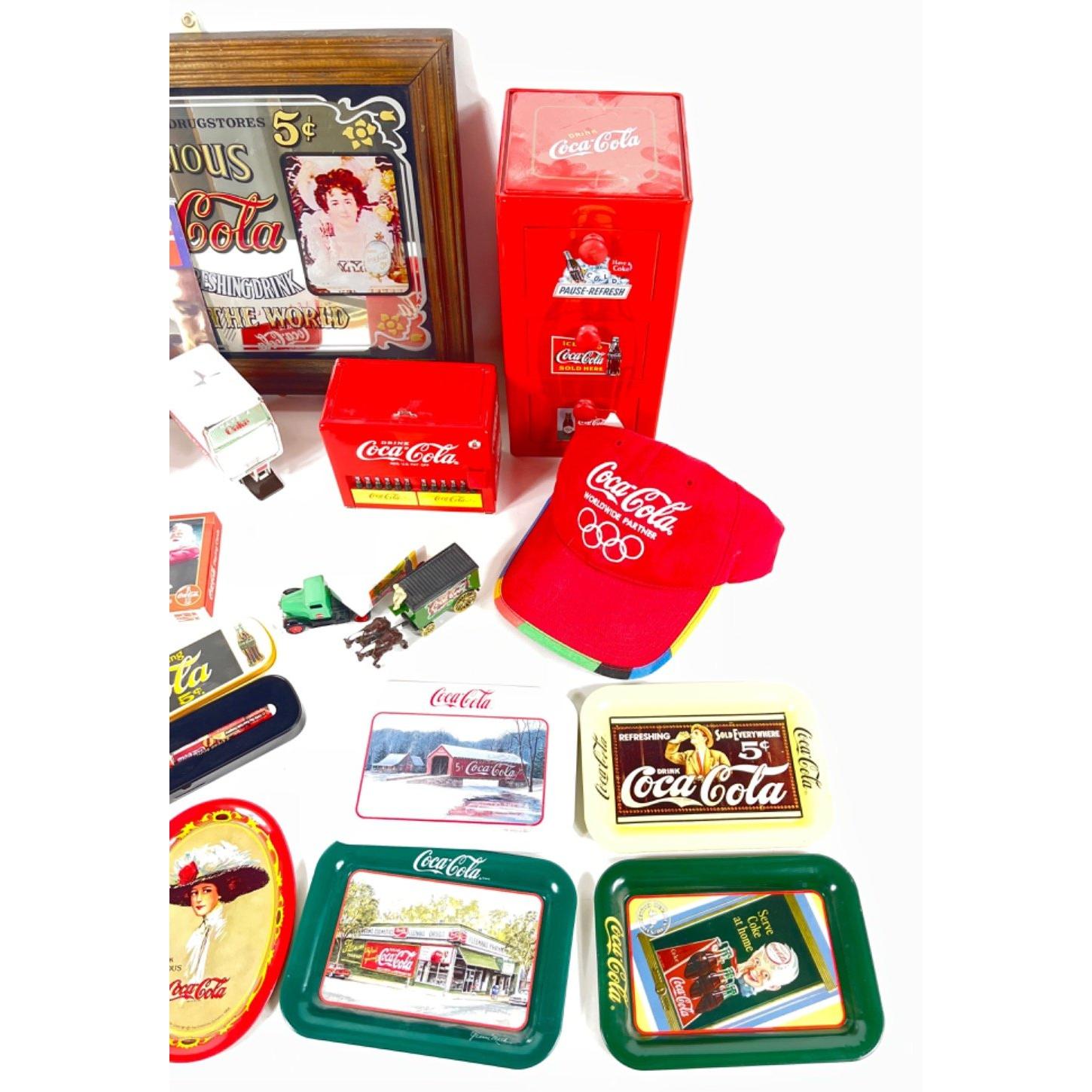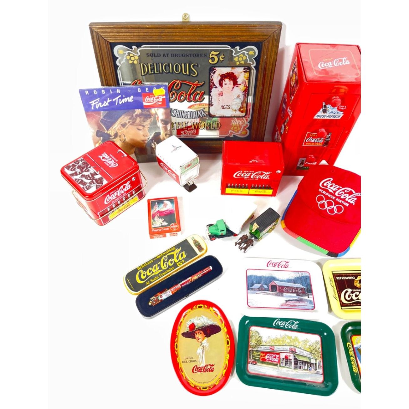 COCA-COLA - a collection of various Coca-Cola items to include a baseball cap, a sealed 7" record of 'First Time' by Robin Beck, 4 small trays (17x12cm), 1 oval tray (15x11cm approx), a Coca-Cola pen in a presentation tin, a small 3 drawer cabinet (25x13x13cm has a few small dents), a pack of playing cards, a money box etc