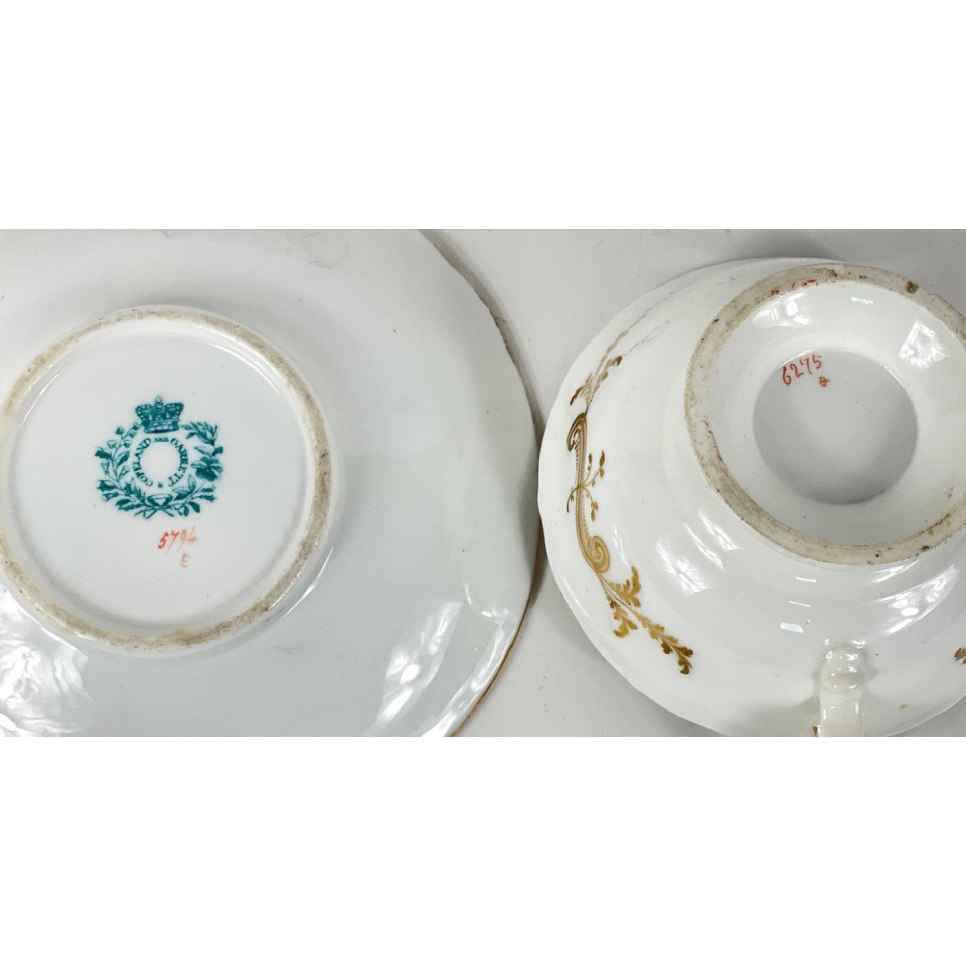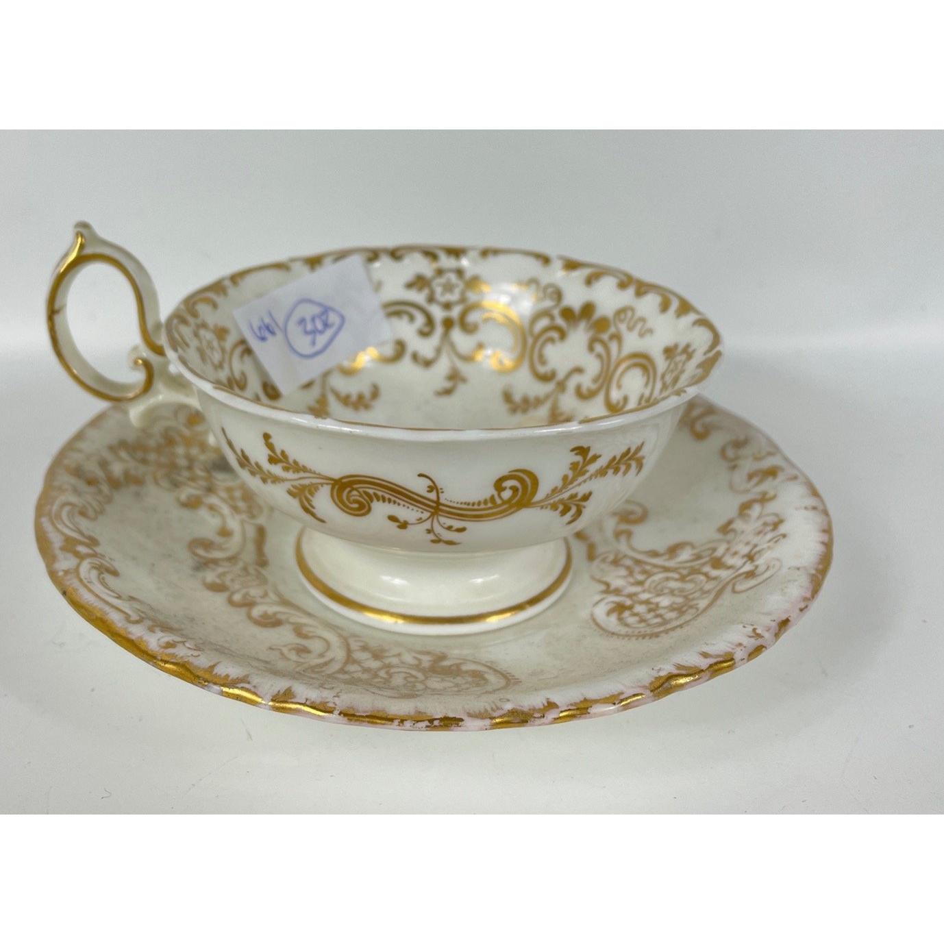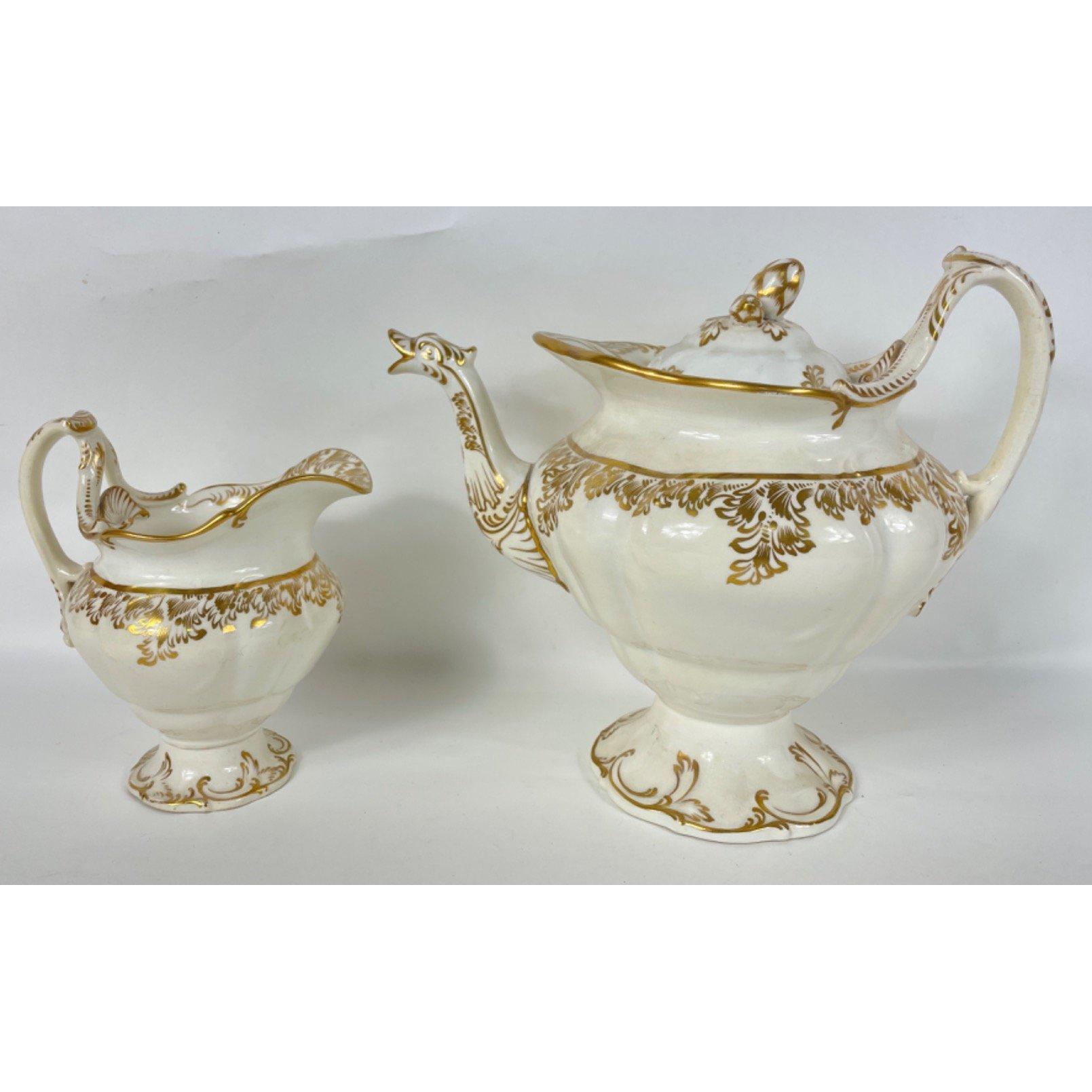 19th Century STAFFORDSHIRE pottery teapot, a lobed body with HoHo bird spout and acorn finial, with printed decoration highlighted in gilt flora dimensions height 24cm width 26cm approx - with a matching large milk jug 16cm height, and similar matching cup, saucer, small shallow bowl and sideplate