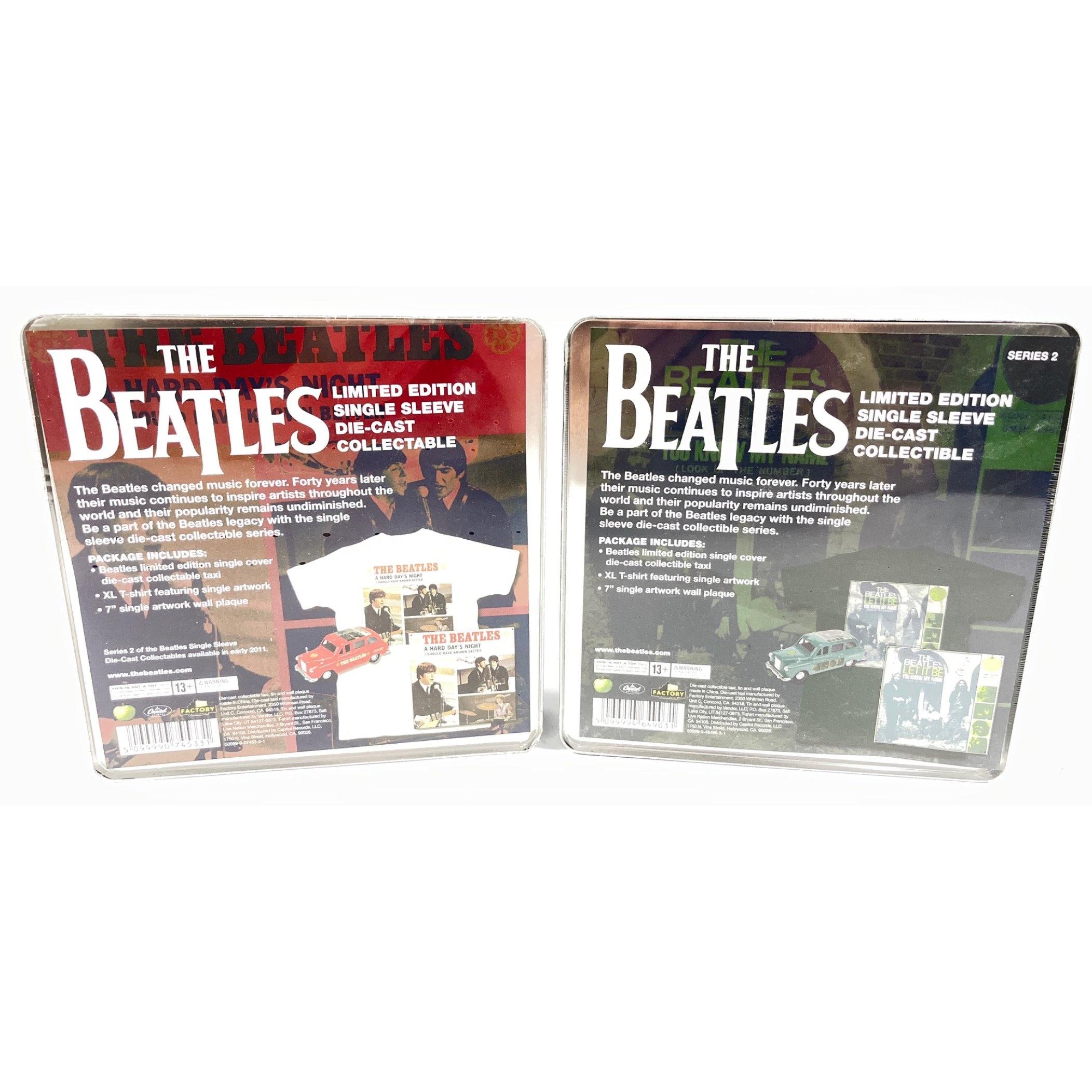 THE BEATLES single sleeve die-cast collectables series 1 and 2. The shrink-wrapped tins contain model taxis, XL t-shirt and enamel wall plaque tin. Tin measures 20cm, Series 1 tin has a small dent in the lid