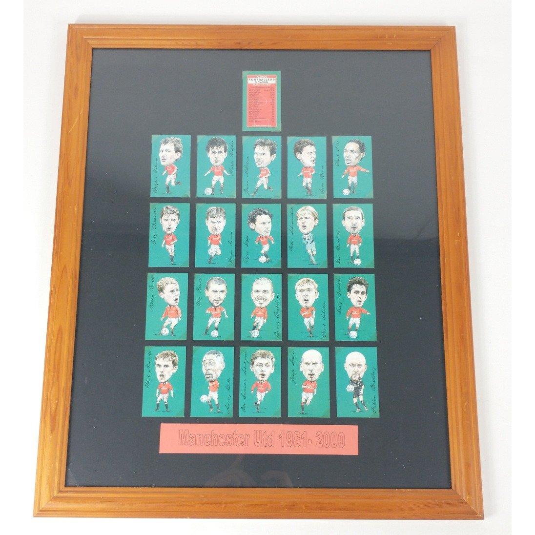 MANCHESTER UNITED - a framed set of collectors' cigarette cards with team members from 1981-2000 plus 3 collector's plates commemorating Barclays Premier League Winners 2006-2007 and 2008-09, Champions from 1908-2011,