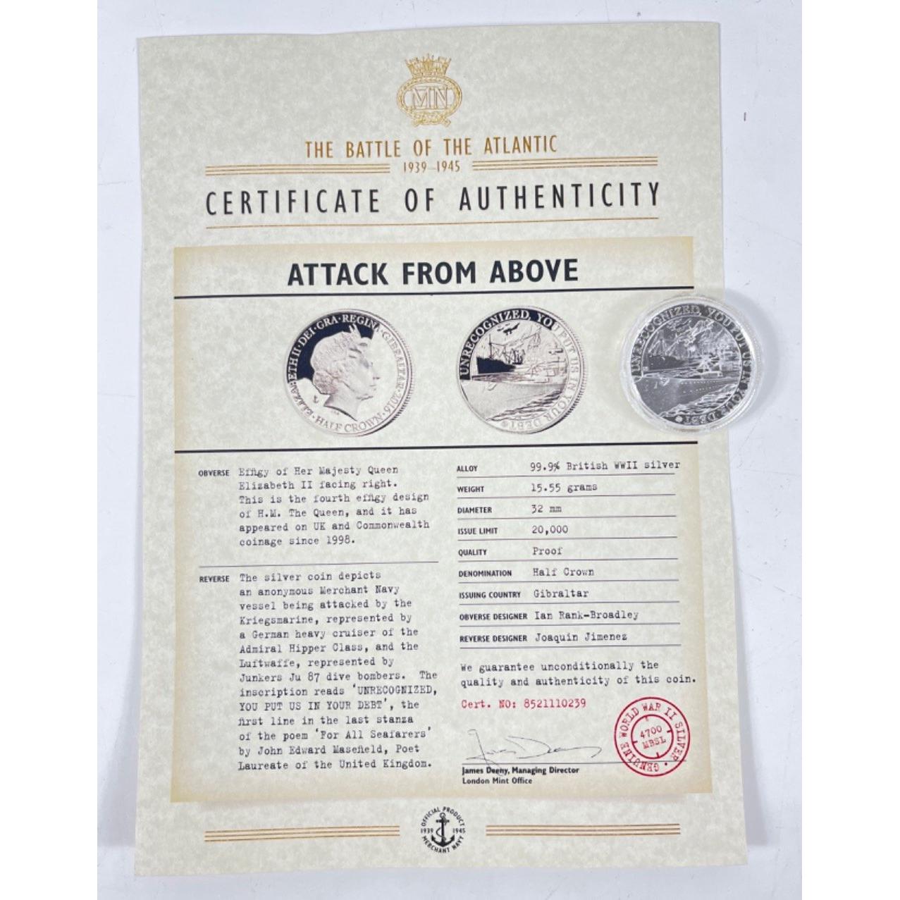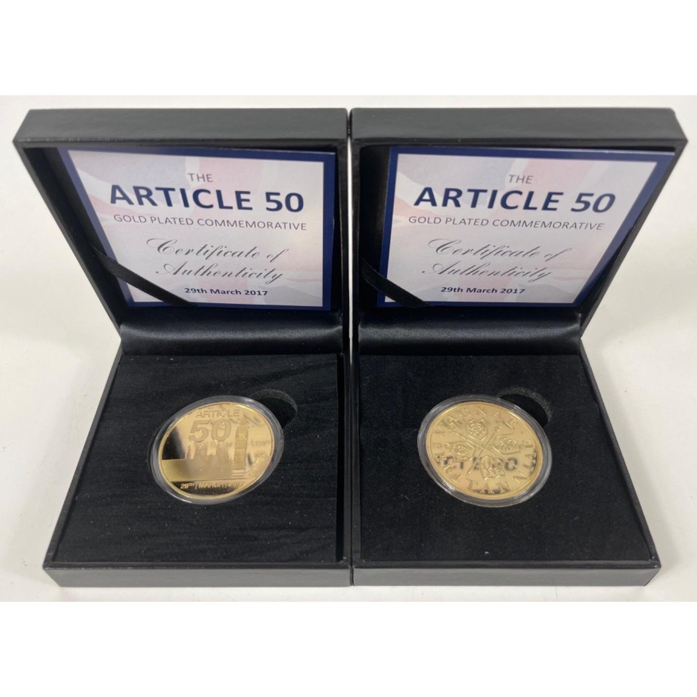 A Gibraltar half-crown 'attack from above' 1/2 oz silver and an article 50 gold plated commemorative 29th March 2017 coin with a certificate of authenticity - 4 coins in total.Approx 4 pieces