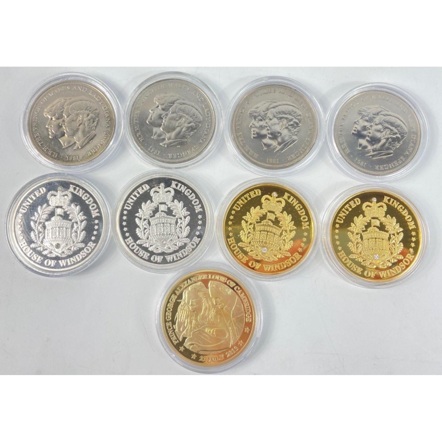 All fully encapsulated Prince George of Cambridge 2013 gold plated commemorative coin, a Prince and Princess of Wales 1981 coin, a Prince Louis of Cambridge 2013 coin and a 2013 Prince George of Cambridge silver plated commemorative coin