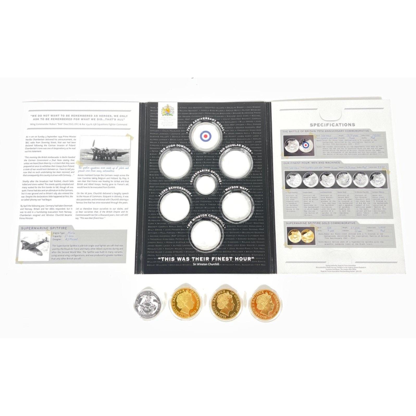 An RAF squadrons of The Royal Air Force 50 pence plated coins and Their Finest Hour 75th Battle of Britain 1940 - all within their original accompanying presentation documentsApprox 1 pieces