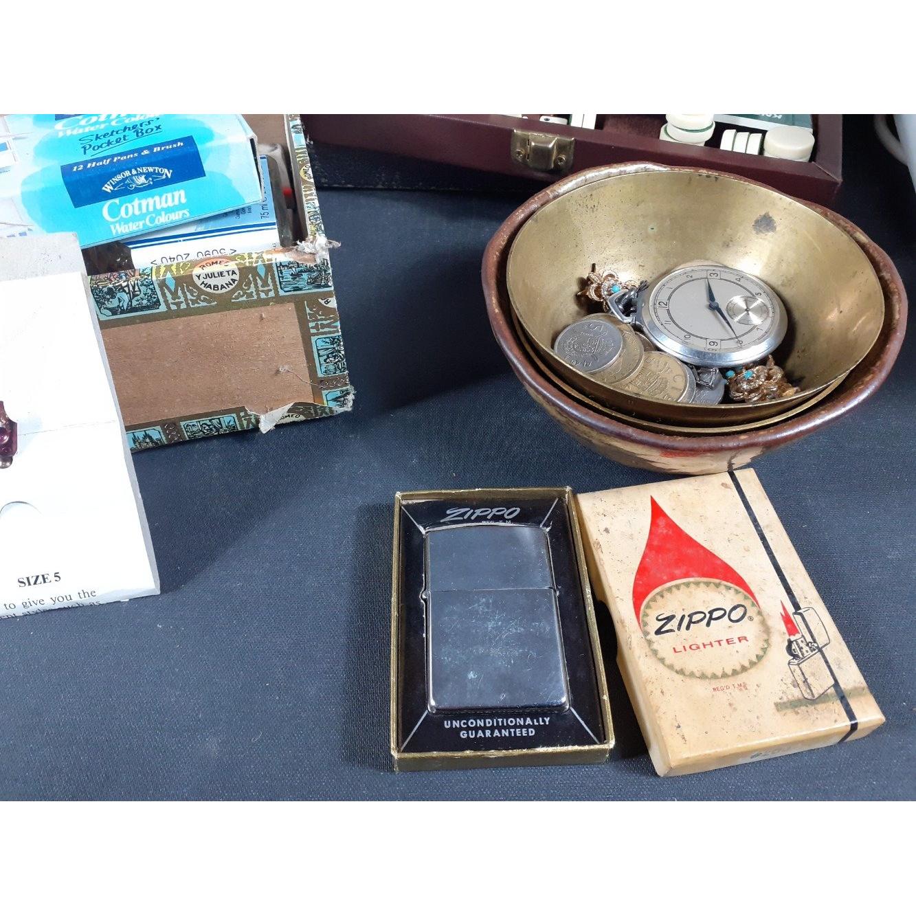 Mixed lot to include wooden chandelier, box containing calligraphy supplies, a vintage ZIPPO lighter in box, a silver napkin ring in holder, a steamer, a backgammon set, a boxed set of cutlery and two matching trench art shells and various other items