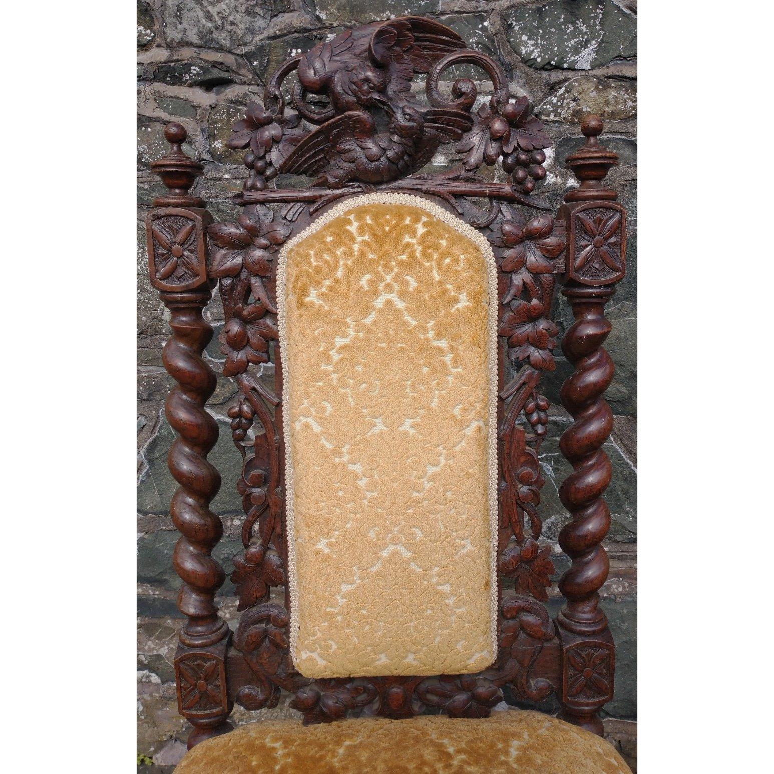 An IMPRESSIVE pair of Victorian Jacobean style wooden turned and hand carved chairs with excellent engraved bird and wildlife scenes. Plush gold fabric to seat pads and backs. 115cm tall approx.