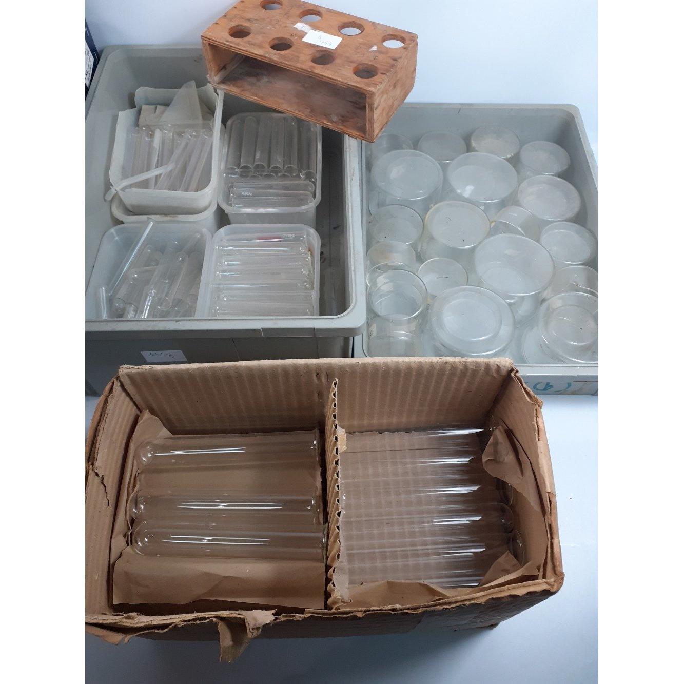 A large collection of CHEMISTS GLASS WARE to include several boxes of Pyrex branded test tubes in various sizes half filled box of BOROSILICATE GLASS 6" x 1" test tubes dated 1957 old wooden tube stands and 3 boxes of varoius chemists glass bottles and dishes