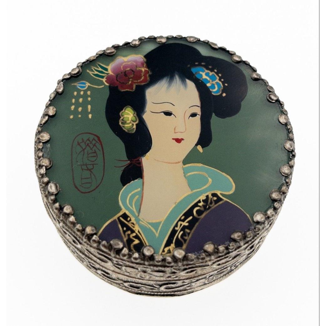 A small Oriental trinket box with mirror inside lid (5.5cm dia approx) with 925 stamped chain (44cm long) and 925 stamped pendant with clear stone, a 925 stamped ring Size Q and a small Celtic cross brooch (2cm long) gross weight 5.5g