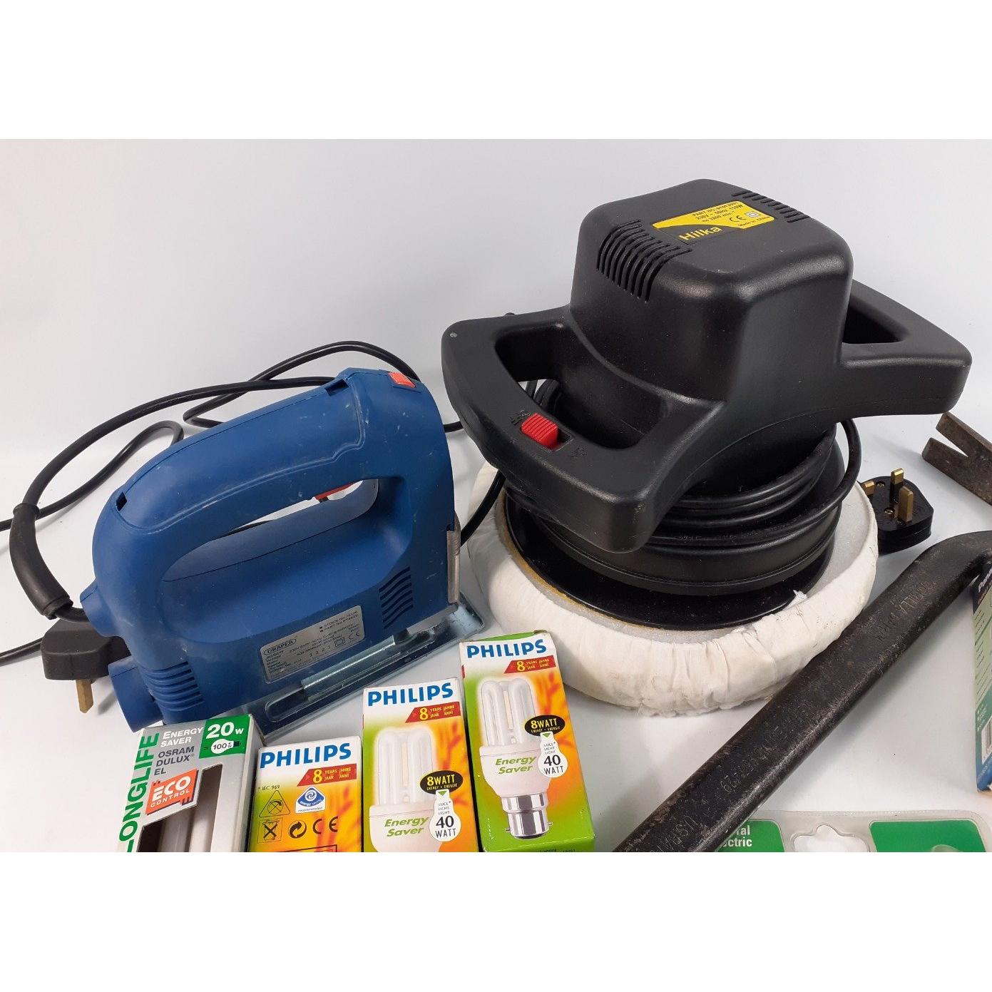 A box containing various household items. HOLKA 91013001 rotary polisher, Draper 75109 jigsaw (no blades), a substantial crow bar and a quantity of modern energy saving light bulbs.
