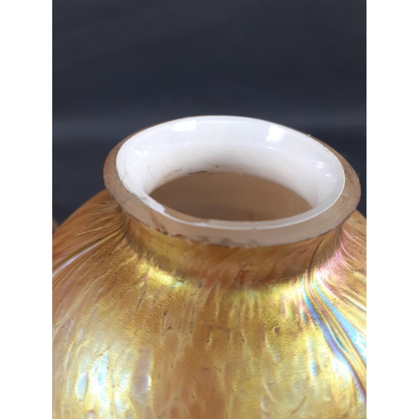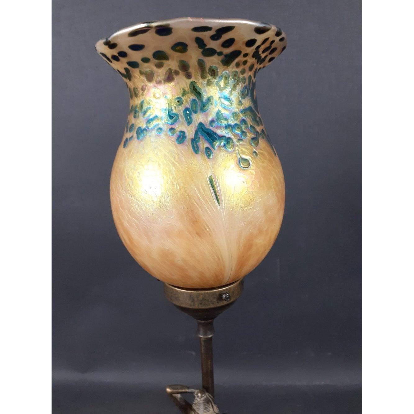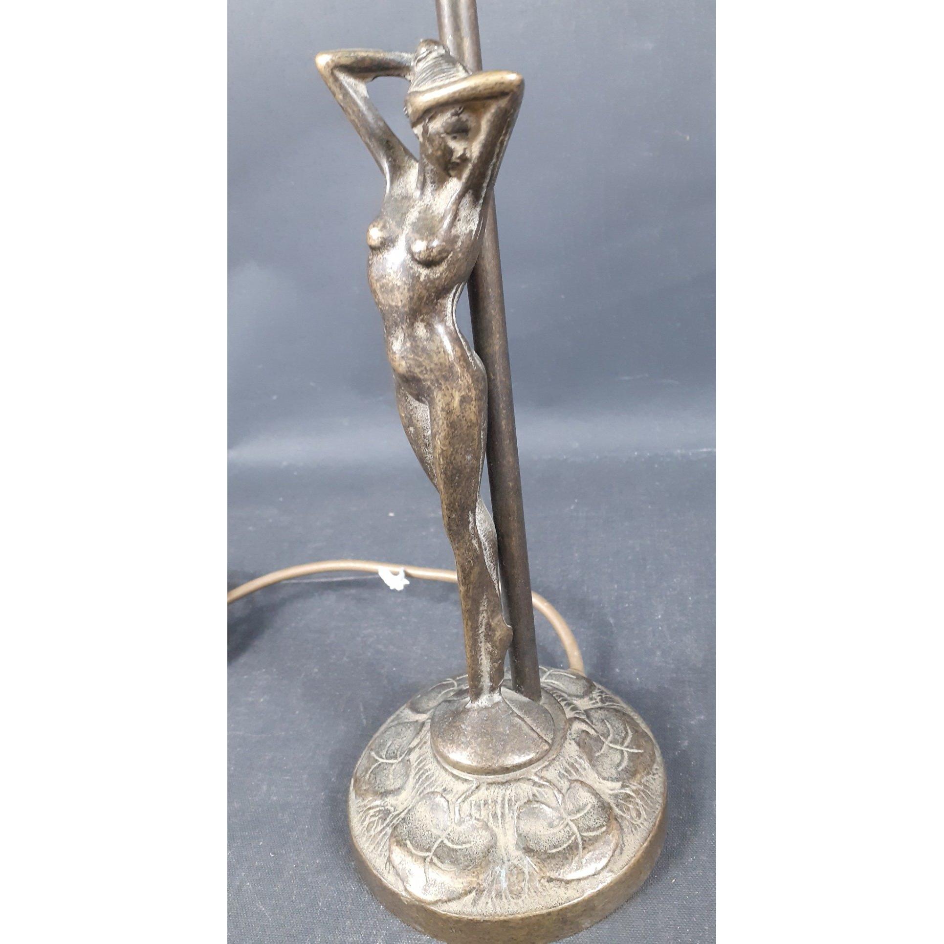 A brass table lamp with a naked lady (21cm tall approx) supporting stem and a HERON GLASS iridescent shade with scalloped edges standing approx 18cm high (small chip from base of shade but not noticeable when in place)