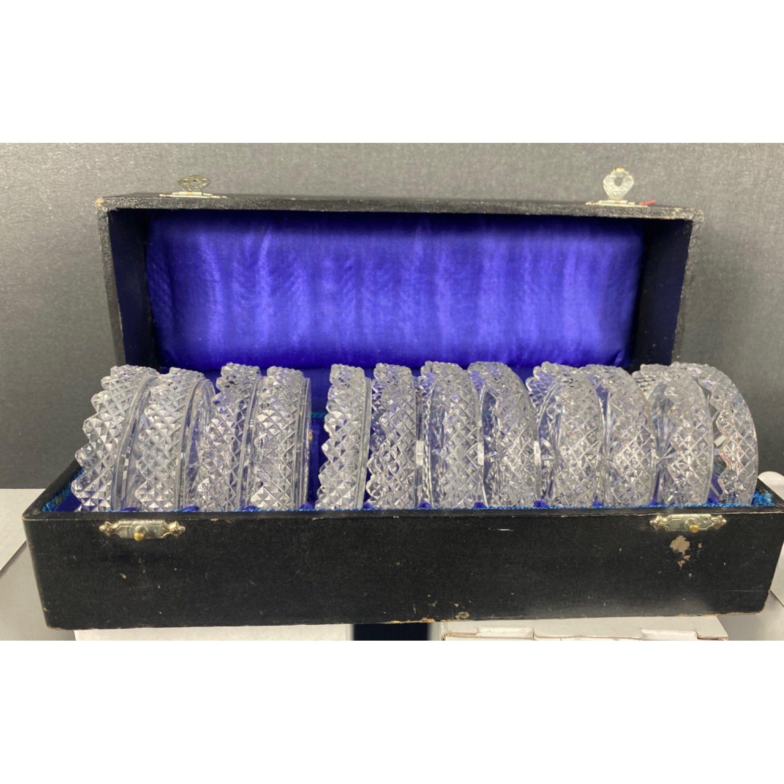 Four boxed pairs of DARTINGTON stemless wine tumblers and a set of twelve crystal glass wine coasters in a fitted box. All in good condition.Approx 5 pieces