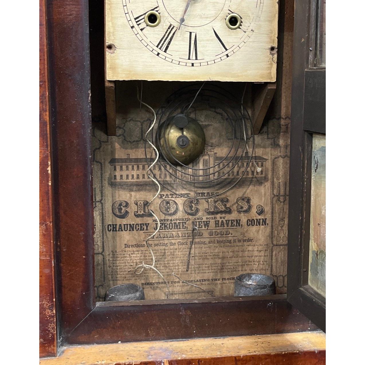 Interesting antique CHAUNCEY JEROME 8 Day wood cased clock with nice reverse painted glass panel depicting ''Presidents House''. This appears to be a mid nineteenth century depiction of the Whitehouse and has been attractively done.